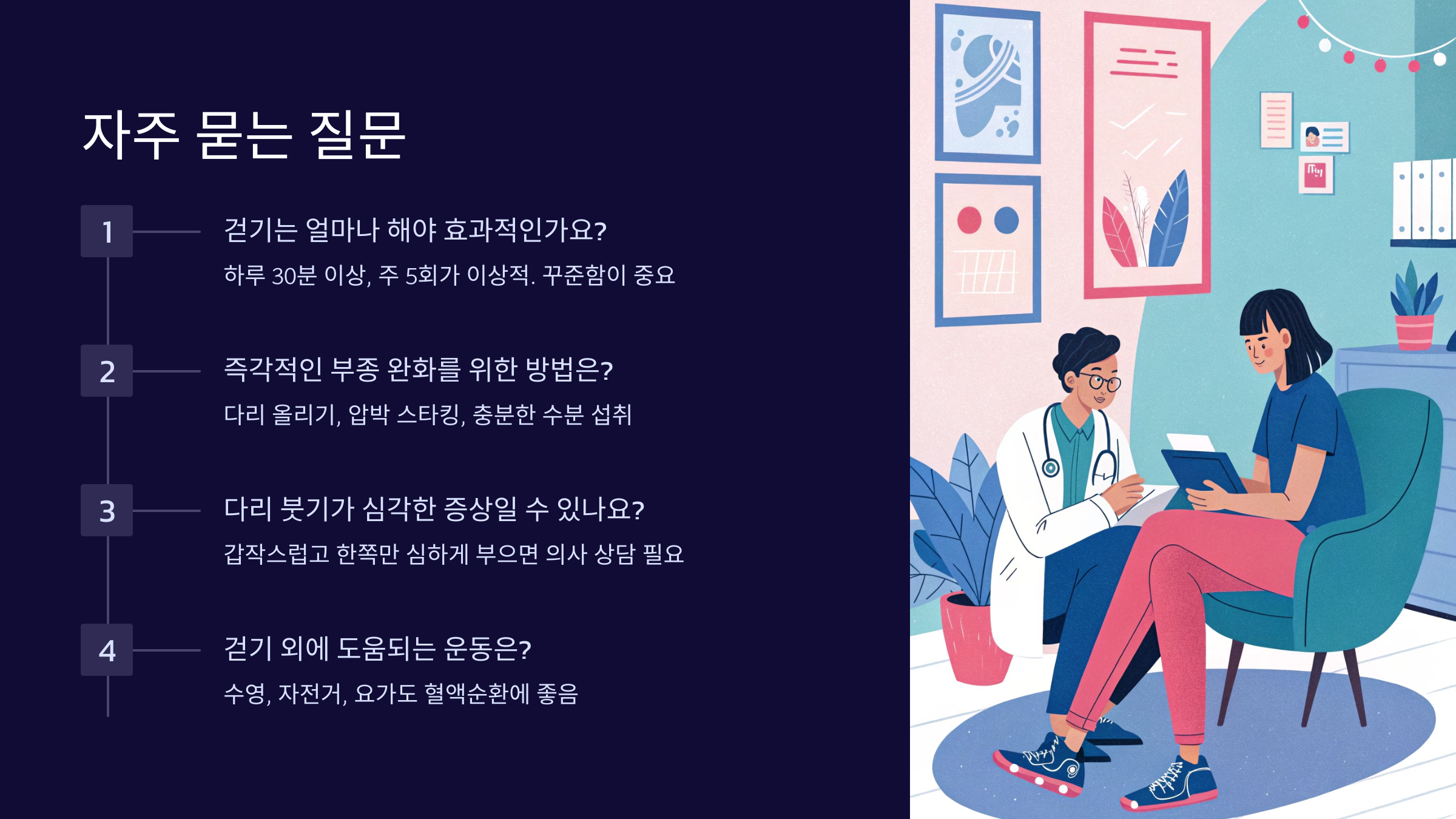 A2. 네, 걷기 직후부터 효과를 느낄 수 있어요. 30분 정도 걸은 후에는 다리가 가벼워지는 느낌을 받을 거예요. 하지만 근본적인 개선을 위해서는 최소 2-3주 정도의 꾸준한 운동이 필요해요.