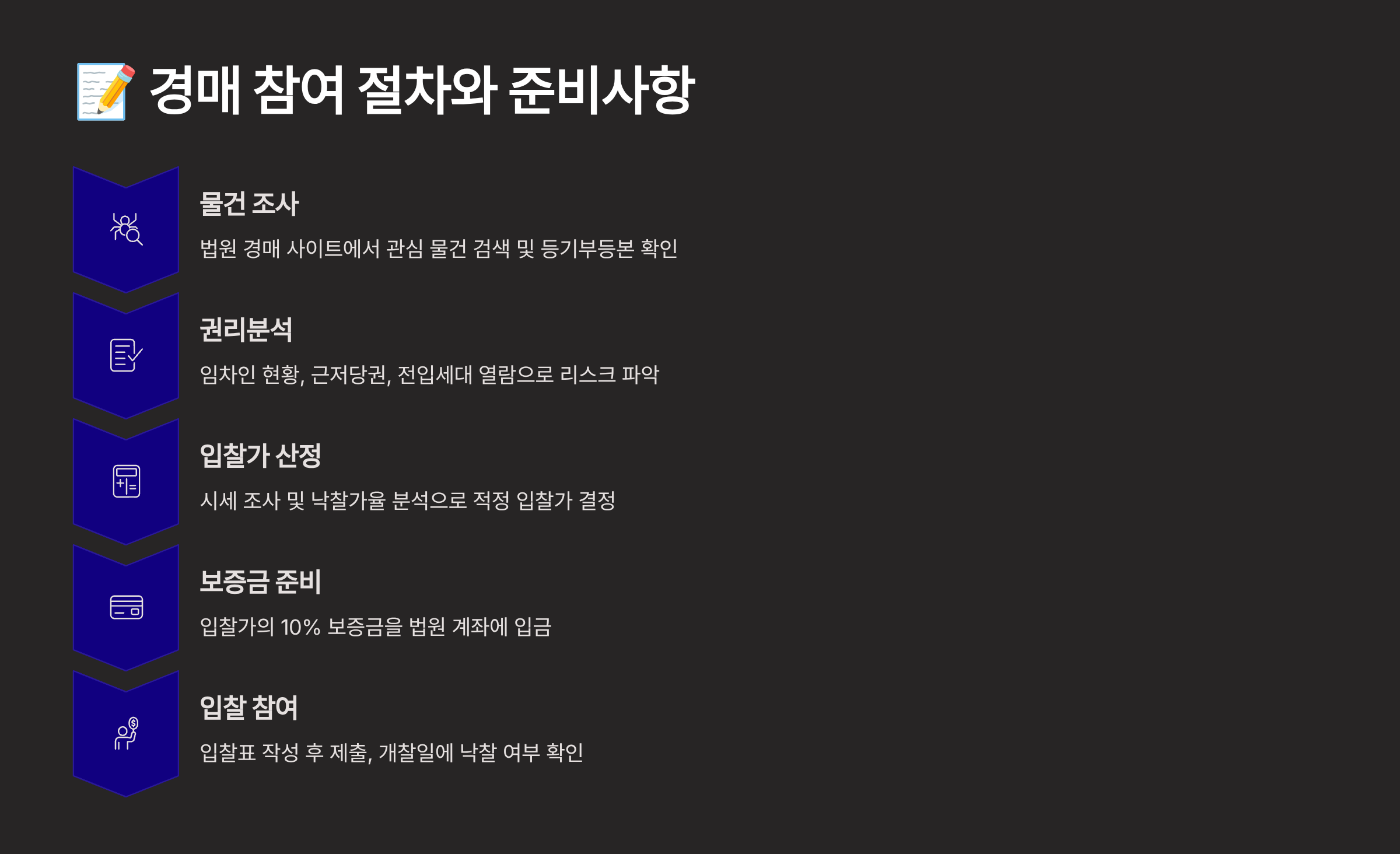 | 입찰 준비 | 보증금, 입찰가 | 신분증, 인감 | 1일 |