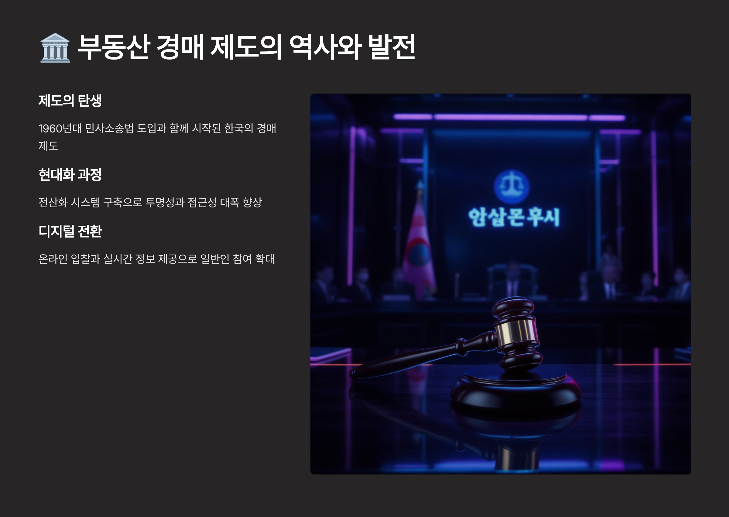 우리나라의 부동산 경매 제도는 1960년 민사소송법 제정과 함께 시작되었어요. 초기에는 주로 금융기관이나 전문 투자자들만 참여하는 시장이었지만, 1990년대 IMF 외환위기를 거치면서 일반인들도 관심을 가지기 시작했답니다. 특히 2000년대 들어 인터넷 경매 정보 서비스가 활성화되면서 접근성이 크게 향상되었어요. 대법원 경매정보 사이트가 개설되고, 온비드와 같은 공공기관 경매 플랫폼이 등장하면서 투명성도 높아졌죠.