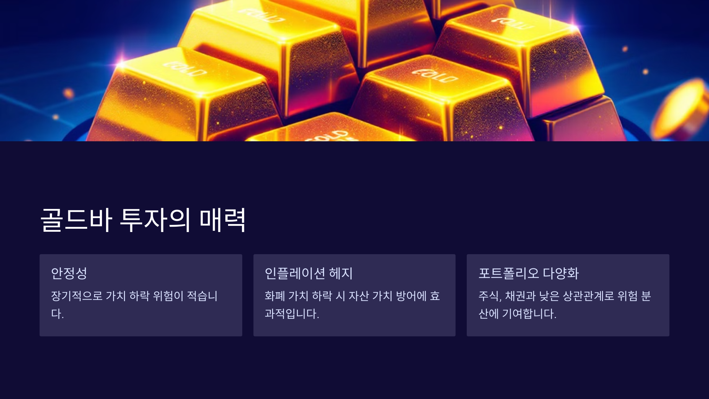 | 골드바 | 안전자산, 인플레이션 헤지 | 보관 문제, 배당 없음 |