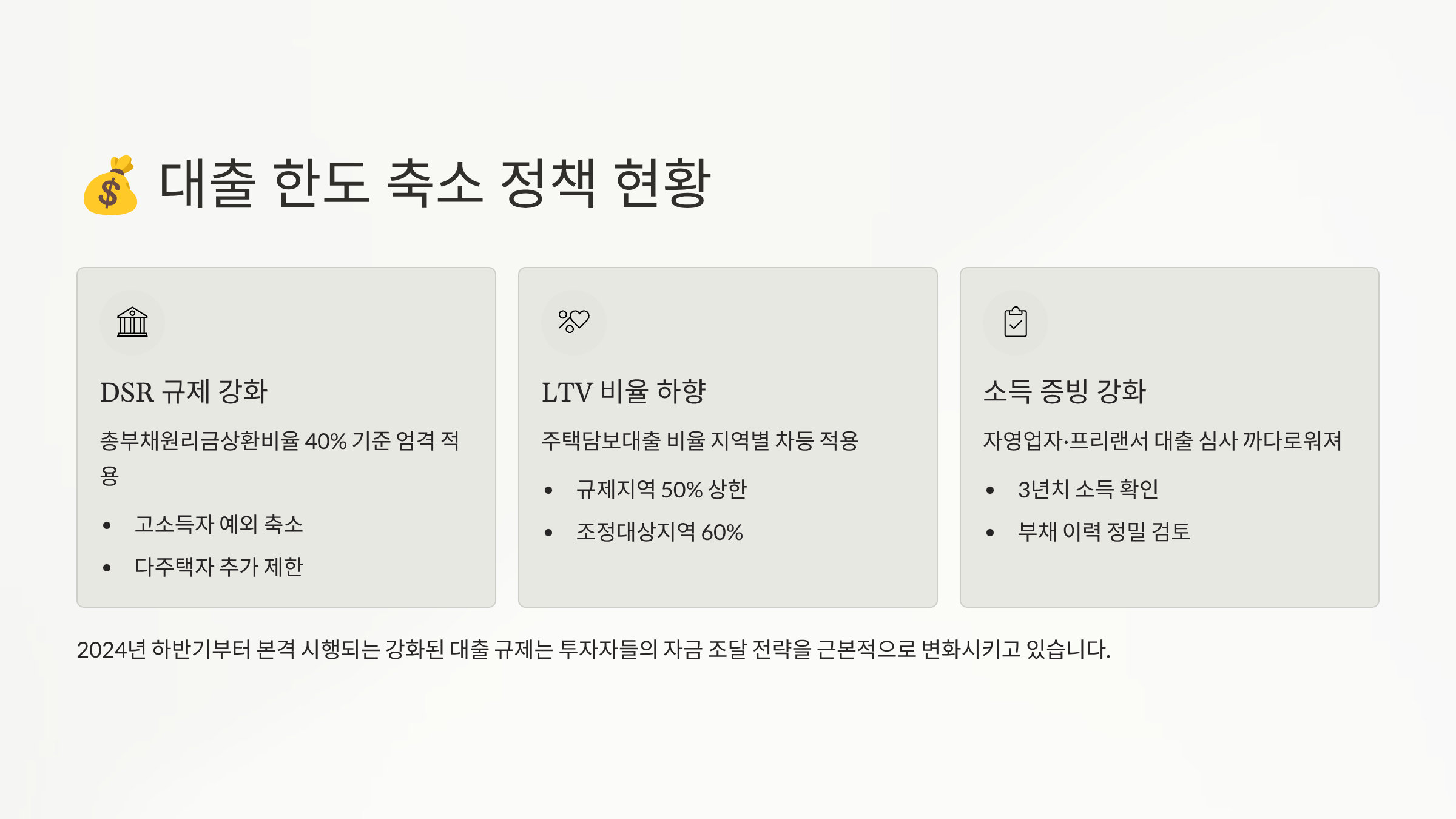 2025년 부동산 시장이 큰 변화를 맞이하고 있어요. 정부의 대출 규제 강화로 인해 투자자들의 자금 조달 환경이 크게 달라졌답니다. DSR 규제 강화, LTV·DTI 한도 축소 등으로 대출 가능 금액이 줄어들면서 부동산 투자 전략의 전면적인 수정이 불가피해졌어요. 이제는 과거의 레버리지 중심 투자에서 벗어나 새로운 접근법이 필요한 시점이에요.
