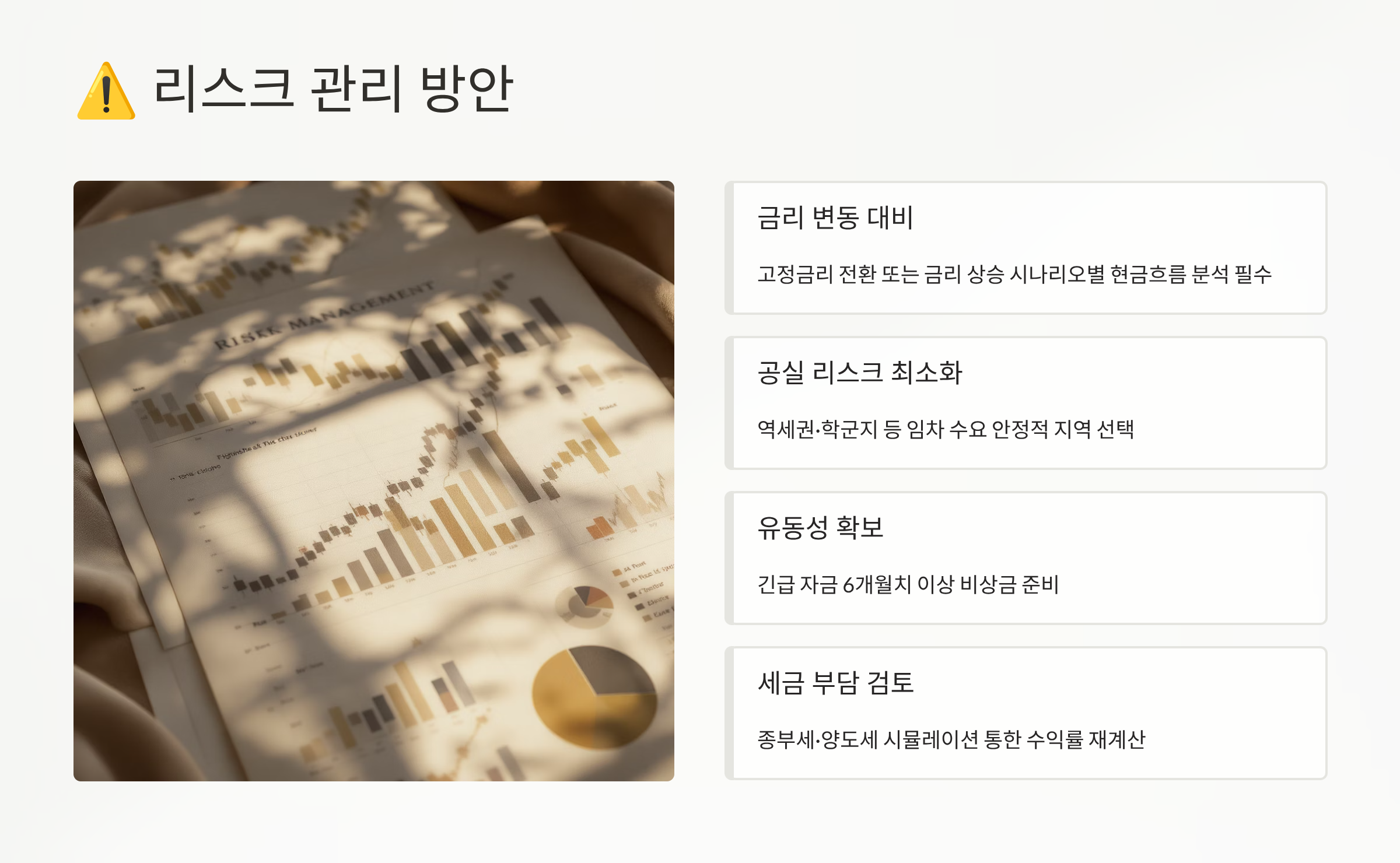 세금 리스크 관리도 필수예요. 취득세, 재산세는 물론 향후 양도세까지 고려한 투자 계획을 세워야 한답니다. 특히 다주택자 중과세, 단기 양도 중과세 등 세법 변화를 주시하세요. 절세 전략과 함께 세금 납부를 위한 자금 계획도 미리 준비해두어야 해요.