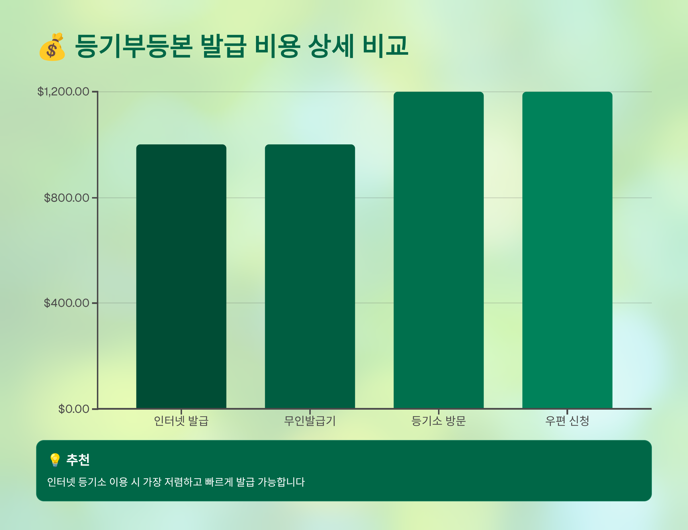 등기부등본 발급 비용은 발급 방법과 유형에 따라 달라요. 인터넷등기소를 이용하면 가장 저렴하게 발급받을 수 있어요. 열람은 700원, 발급은 1,000원이에요. 단, 열람은 화면으로만 볼 수 있고 저장이나 출력은 안 돼요.
