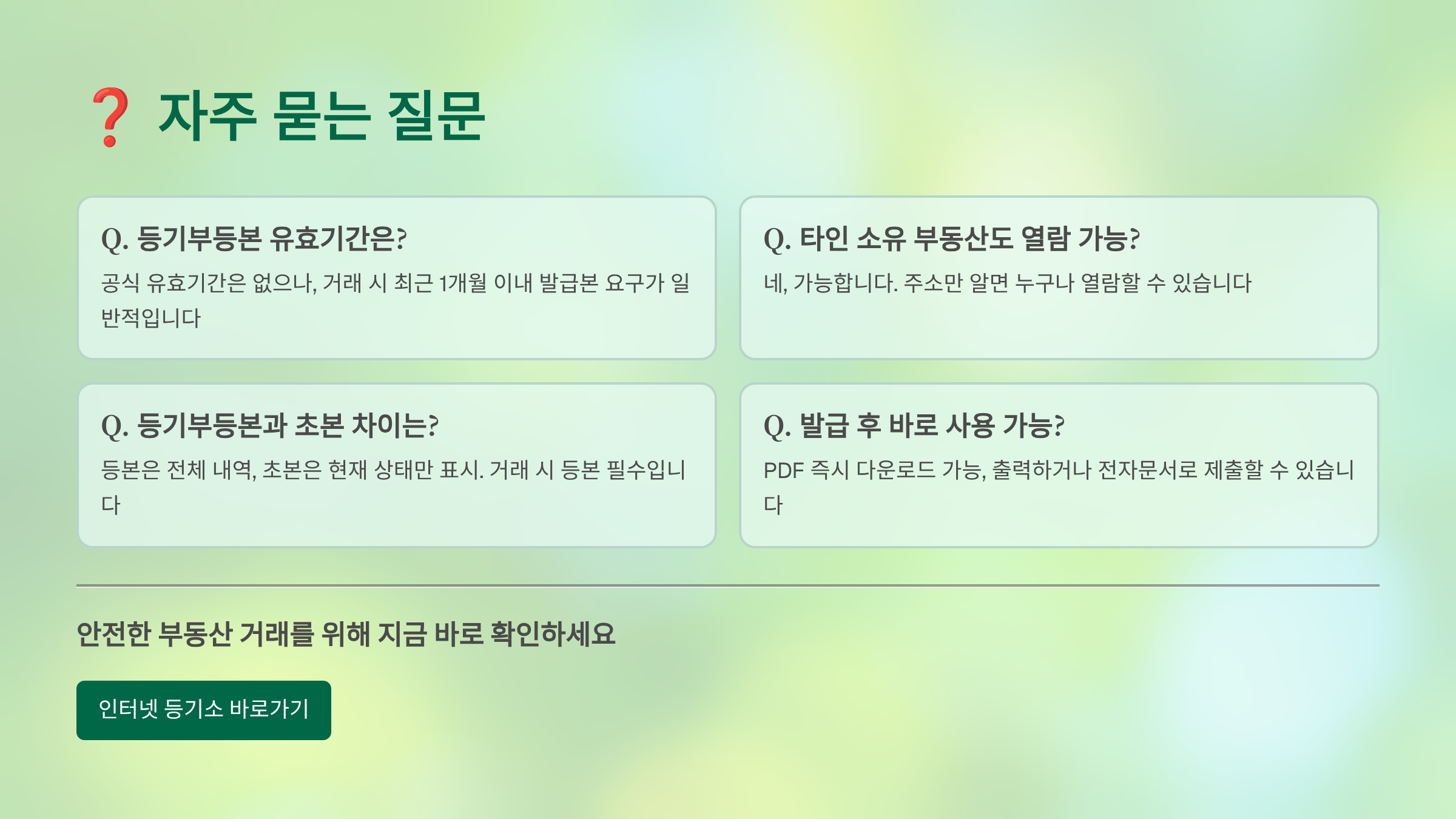 A4. 법적으로 정해진 유효기간은 없어요. 하지만 권리관계가 수시로 변동될 수 있으므로 부동산 거래 시에는 가급적 최근 발급본을 사용하는 것이 좋아요. 보통 발급일로부터 3개월 이내를 권장해요.