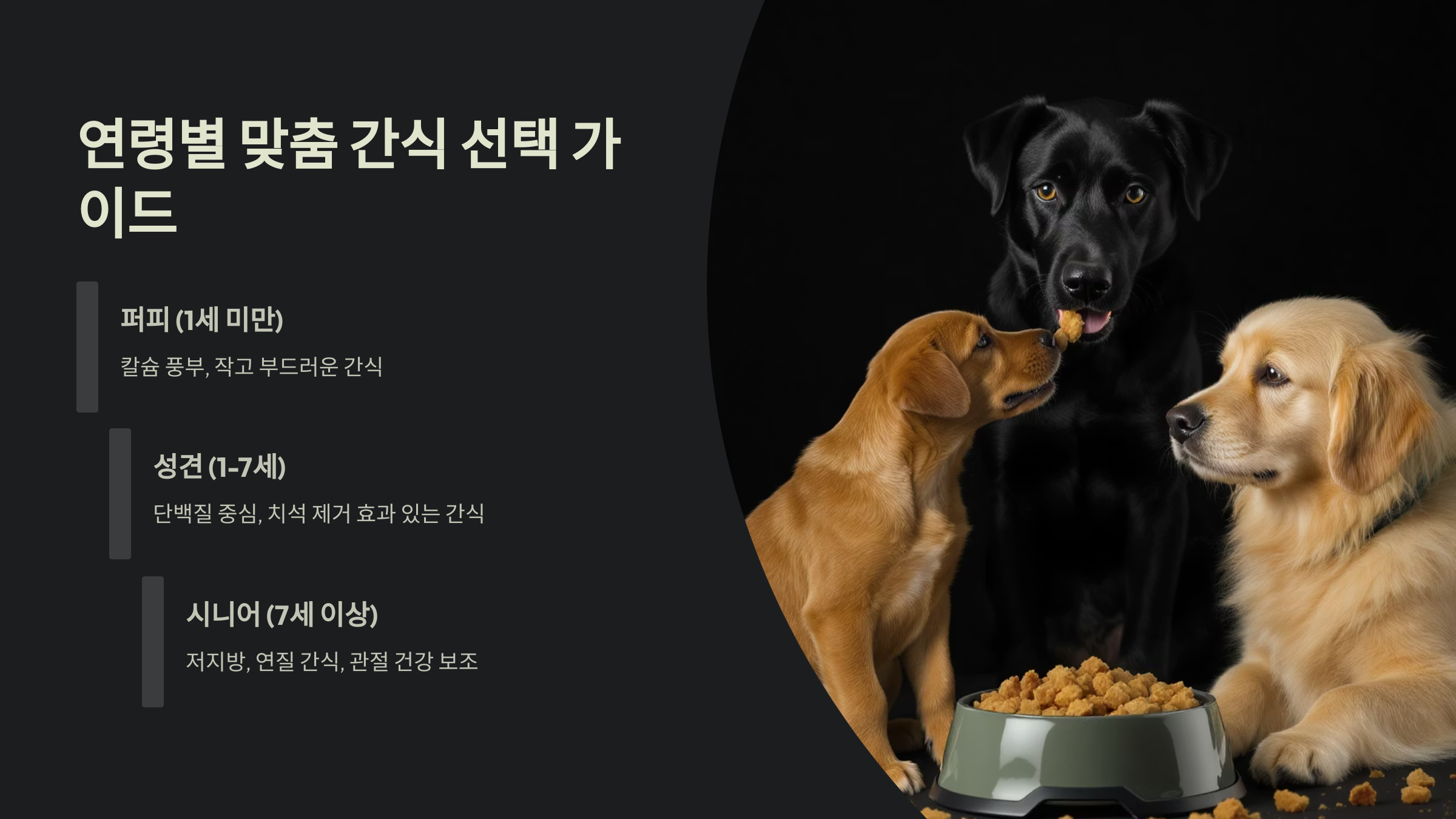 | 퍼피 (2-12개월) | DHA, 칼슘, 단백질 | 부드러운 육포, 퍼피용 비스킷 |
