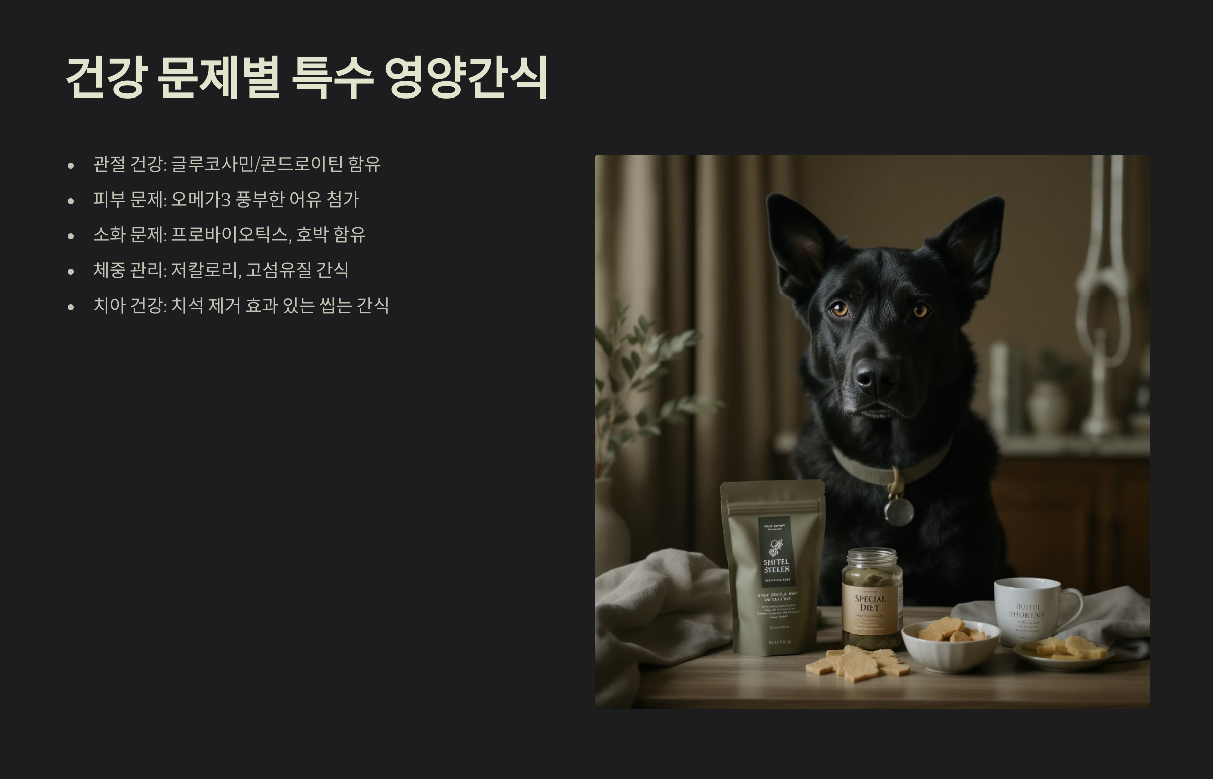| 노령견 (7세+) | 관절 보호, 항산화 | 관절 기능성 간식, 소프트 츄 |