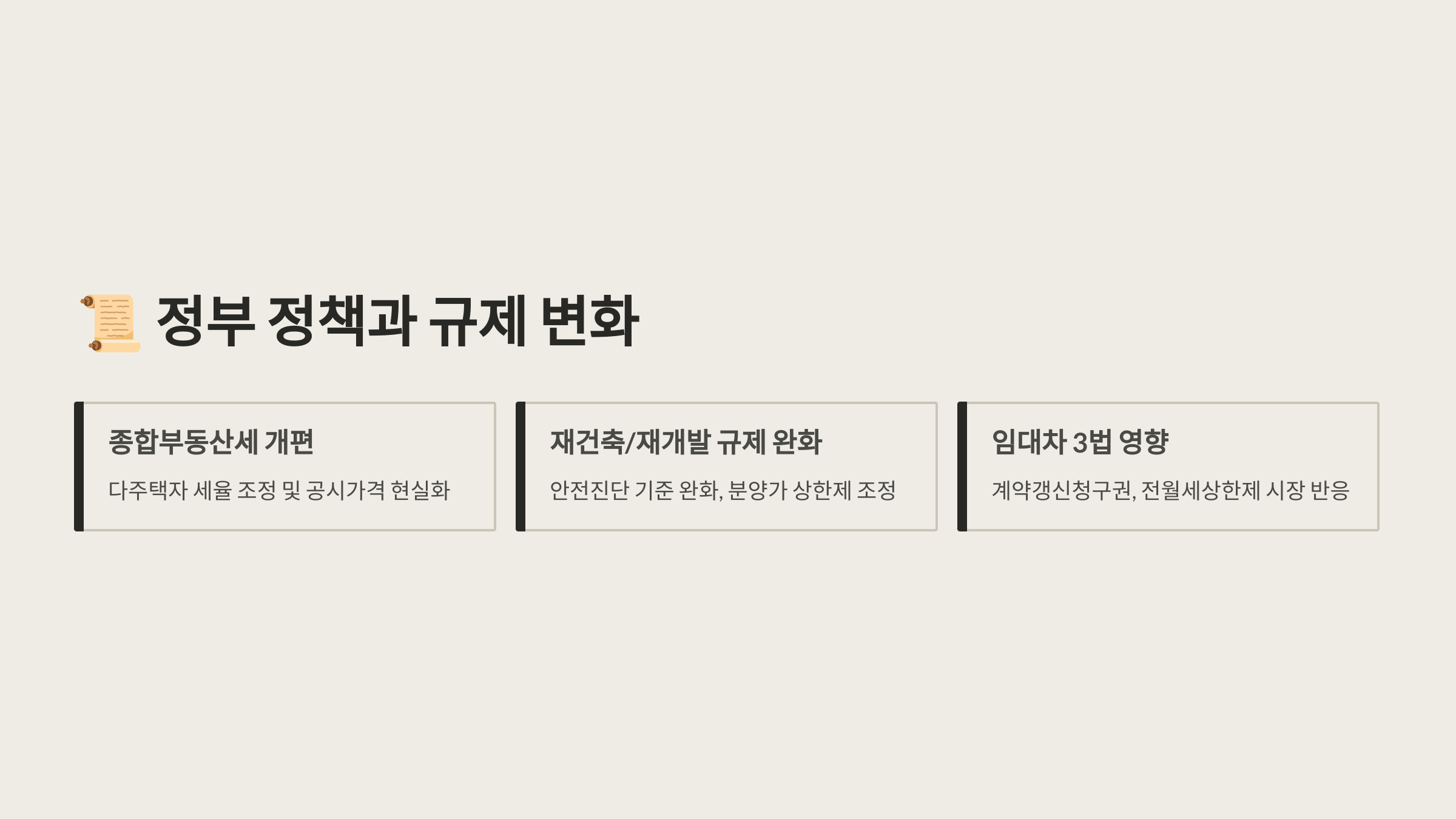 | 재건축 규제 | 안전진단, 용적률 | 노후 아파트 밀집 지역 |