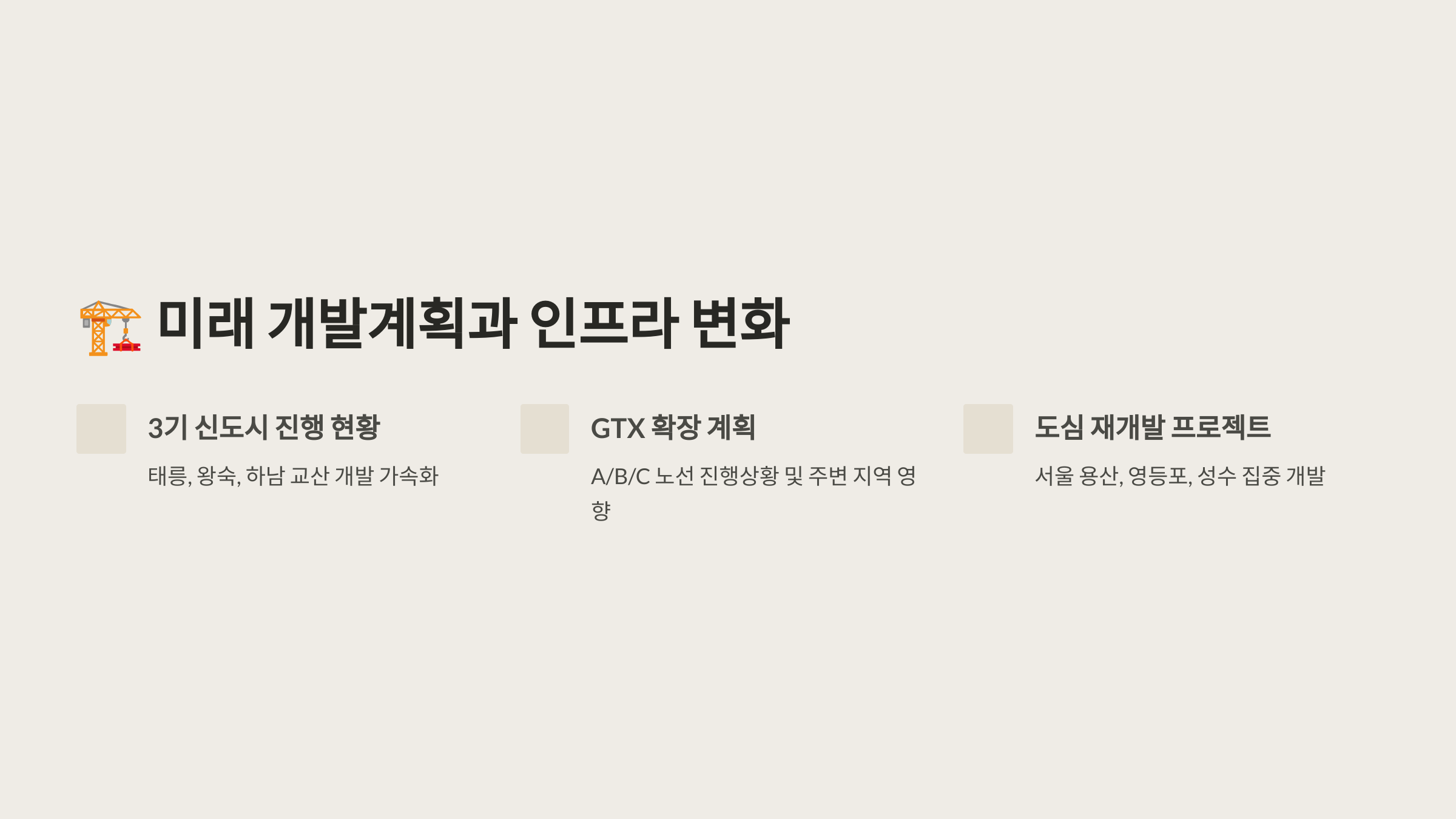 스마트시티 조성 계획도 새롭게 주목받는 요인이에요. 세종시, 부산 에코델타시티처럼 첨단 기술이 접목된 도시는 젊은 층의 선호도가 높아 장기적인 가치 상승이 기대된답니다. 자율주행차 시범 운행 지역, 5G 특화 지구 등도 미래 가치를 높이는 요소들이에요. 🤖