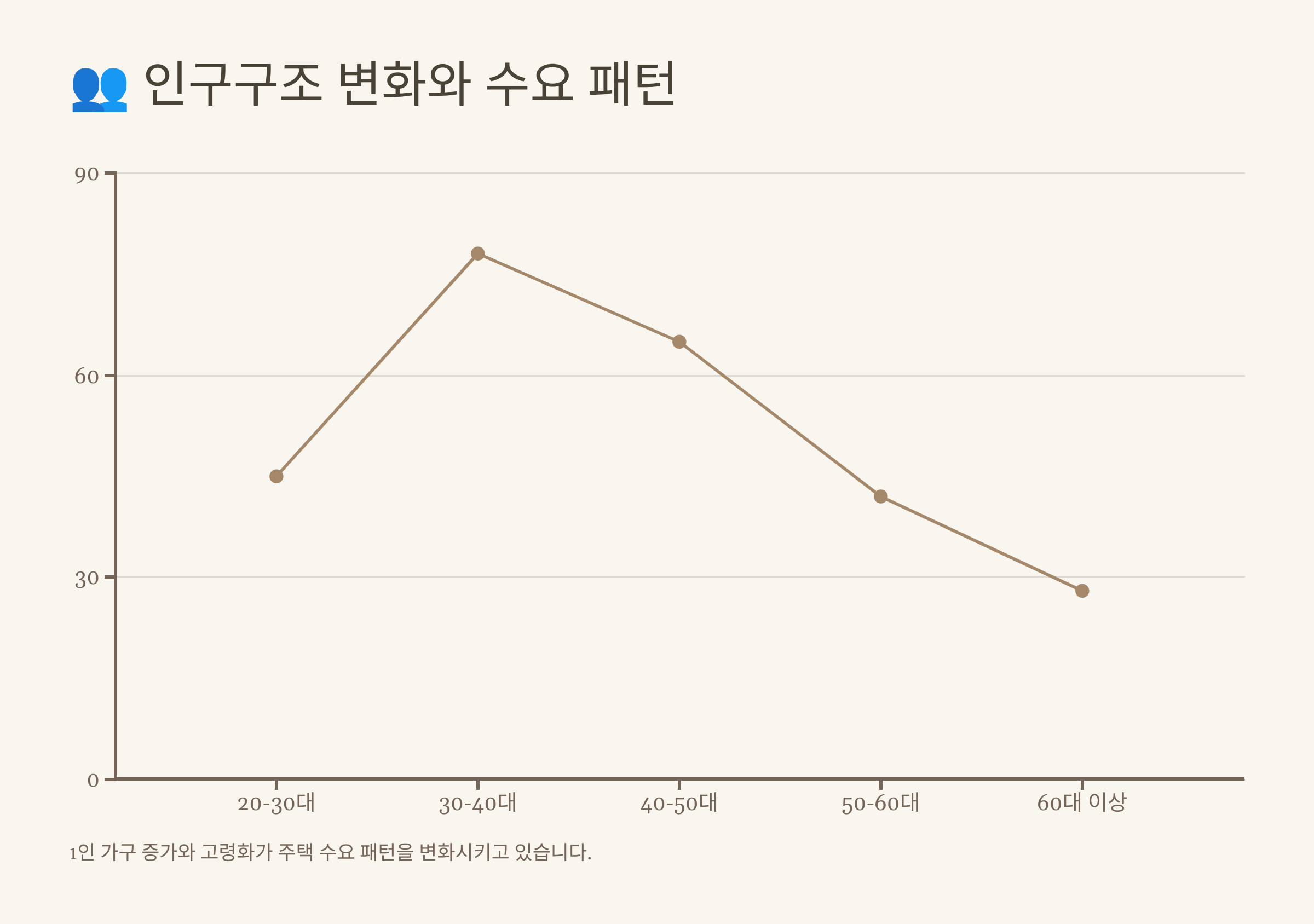 1인 가구 증가는 주택시장의 가장 뚜렷한 변화예요. 2025년 기준 전체 가구의 35%가 1인 가구인데, 이들은 주로 도심 접근성이 좋은 소형 아파트나 오피스텔을 선호해요. 역세권 원룸, 투룸 수요가 꾸준한 이유죠. 특히 젊은 1인 가구는 편의시설과 교통이 편리한 곳을, 고령 1인 가구는 의료시설과 생활 편의시설이 가까운 곳을 선호하는 차이를 보여요.