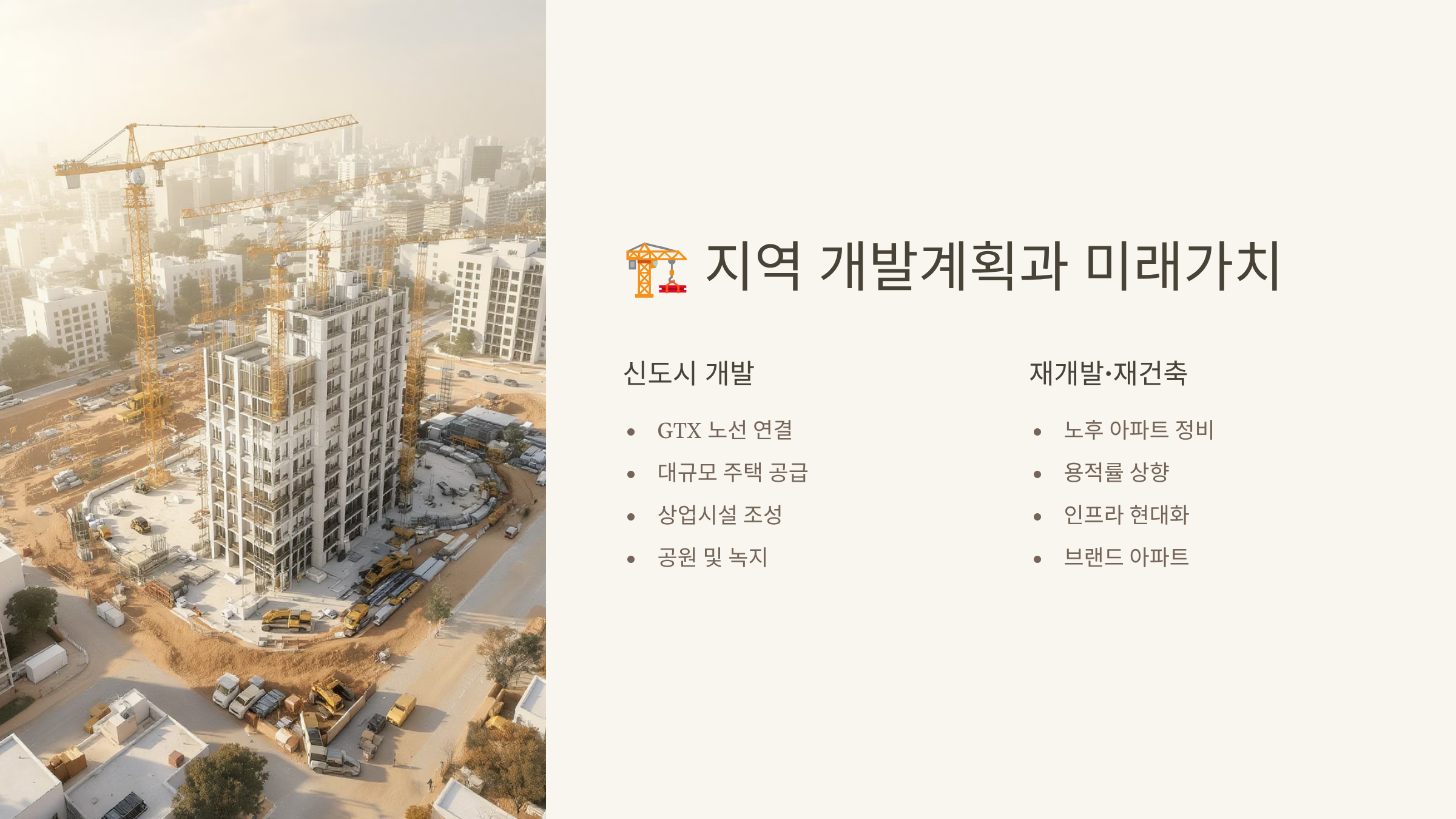 재개발·재건축 사업도 빼놓을 수 없어요. 노후 아파트 단지가 재건축되면 용적률 상향으로 더 많은 세대가 들어서고, 최신 설계와 편의시설로 주거 환경이 크게 개선돼요. 강남 재건축 단지들이 높은 분양가에도 불구하고 청약 경쟁이 치열한 이유죠. 다만 최근 안전진단 기준 강화와 규제로 사업 추진이 쉽지 않아 신중한 접근이 필요해요. 🏢