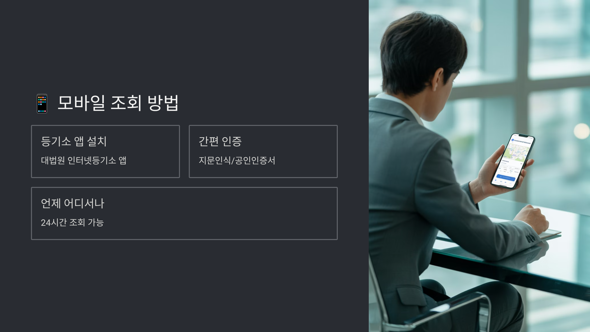 스마트폰으로도 등기부등본을 조회할 수 있어요! 인터넷등기소 모바일 웹사이트나 정부 24 앱을 이용하면 언제 어디서나 부동산 정보를 확인할 수 있답니다. 특히 부동산을 직접 보러 갔을 때 현장에서 바로 확인할 수 있어서 정말 유용해요.