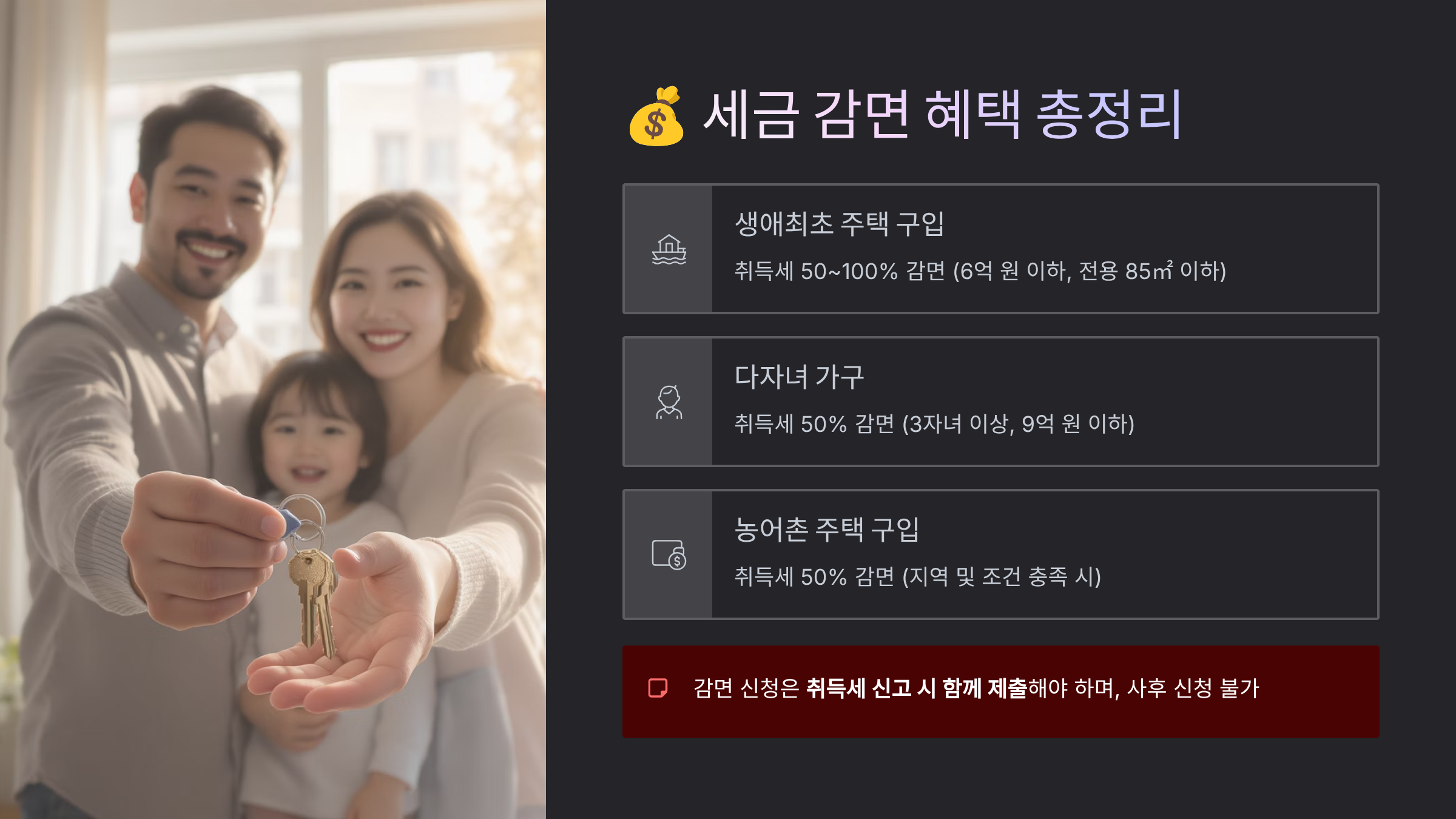 | 다자녀 가구 | 추가 감면 | 미성년 자녀 3명 이상 |