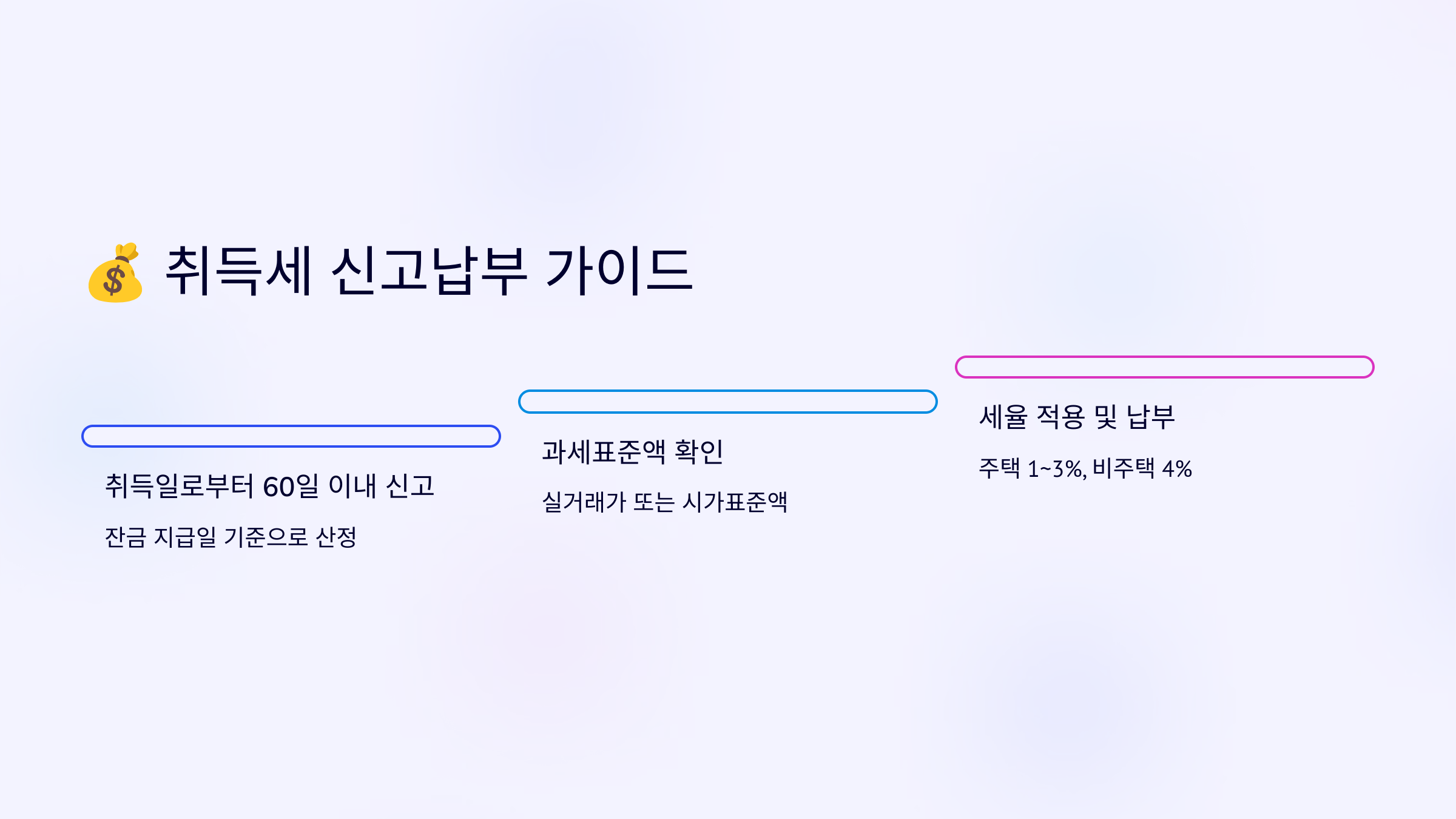 부동산을 취득하면 반드시 내야 하는 세금이 바로 취득세예요. 취득세는 부동산 취득일로부터 60일 이내에 신고하고 납부해야 하는데요, 이 기한을 놓치면 무시무시한 가산세가 붙어요. 20%의 신고불성실 가산세에 하루 0.025%의 납부불성실 가산세까지 더해지니까 정말 조심해야 해요! 💸