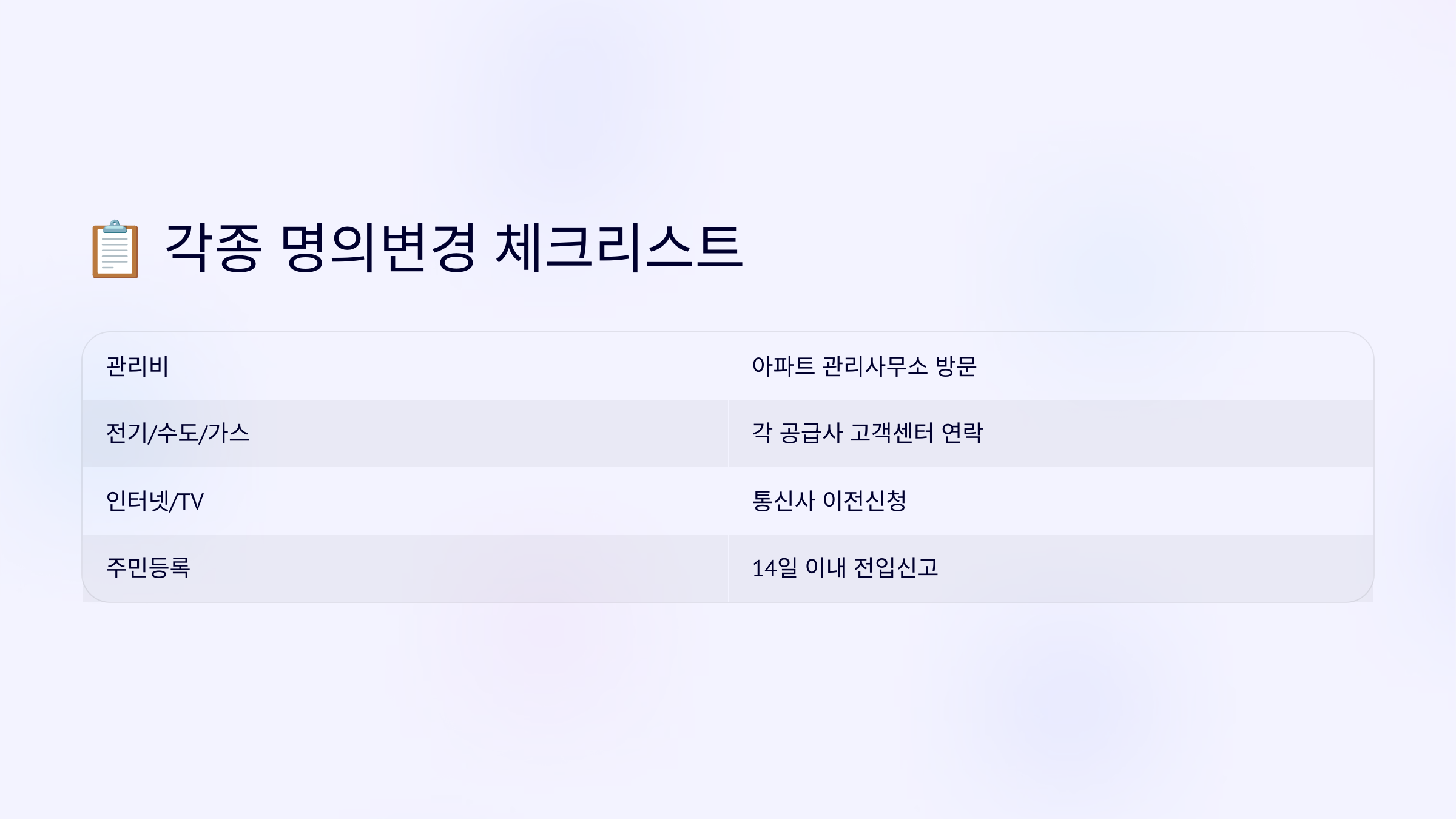 집을 샀으면 이제 각종 명의변경을 해야 해요. 생각보다 바꿔야 할 게 많아서 하나씩 체크리스트를 만들어두고 처리하는 게 좋아요. 전기, 가스, 수도, 인터넷, TV, 관리비 등등... 놓치면 나중에 요금 폭탄을 맞을 수도 있으니 꼼꼼히 챙기세요! 📝