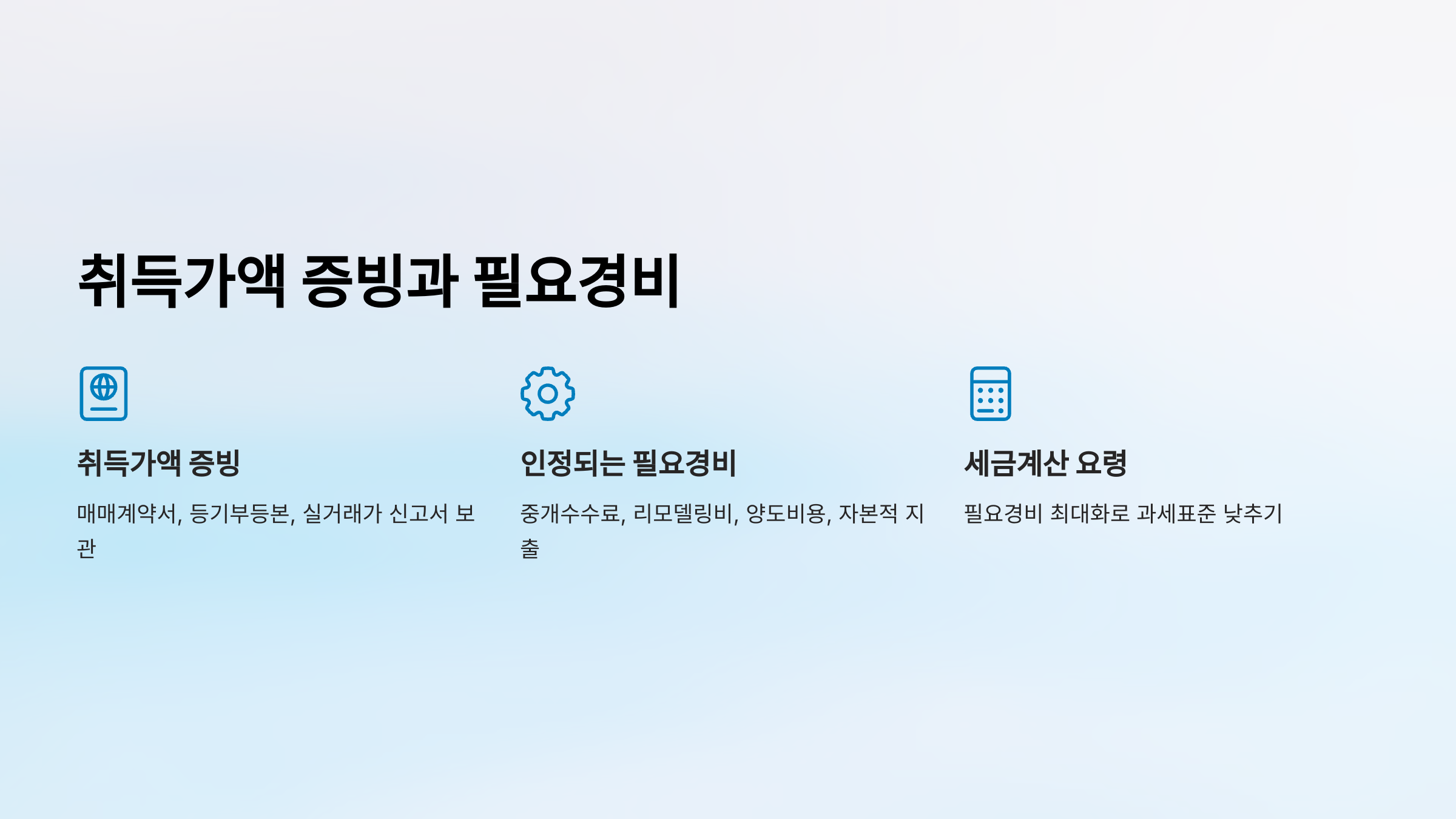세금 계산 시 가장 중요한 건 정확한 취득가액과 필요경비를 증빙하는 거예요. 취득 당시 계약서, 중개수수료 영수증, 리모델링 비용 등 모든 서류를 잘 보관해 두면 나중에 큰 도움이 된답니다.