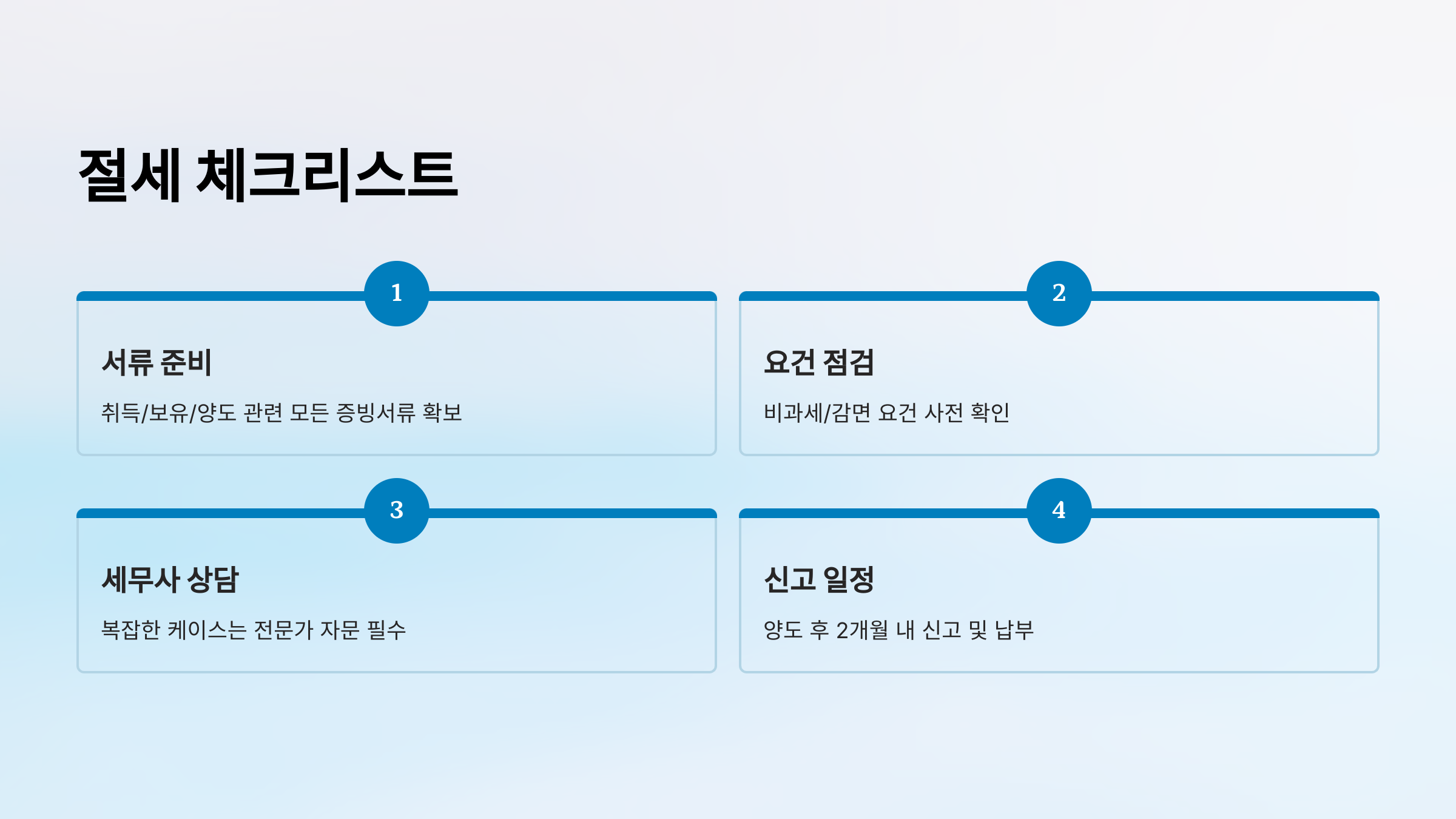 세무 전문가 상담은 선택이 아닌 필수예요. 특히 고가 부동산이나 복잡한 상황이라면 반드시 세무사나 회계사의 도움을 받으세요. 상담료가 아깝다고 생각할 수 있지만, 절세 효과를 생각하면 충분히 가치가 있어요.