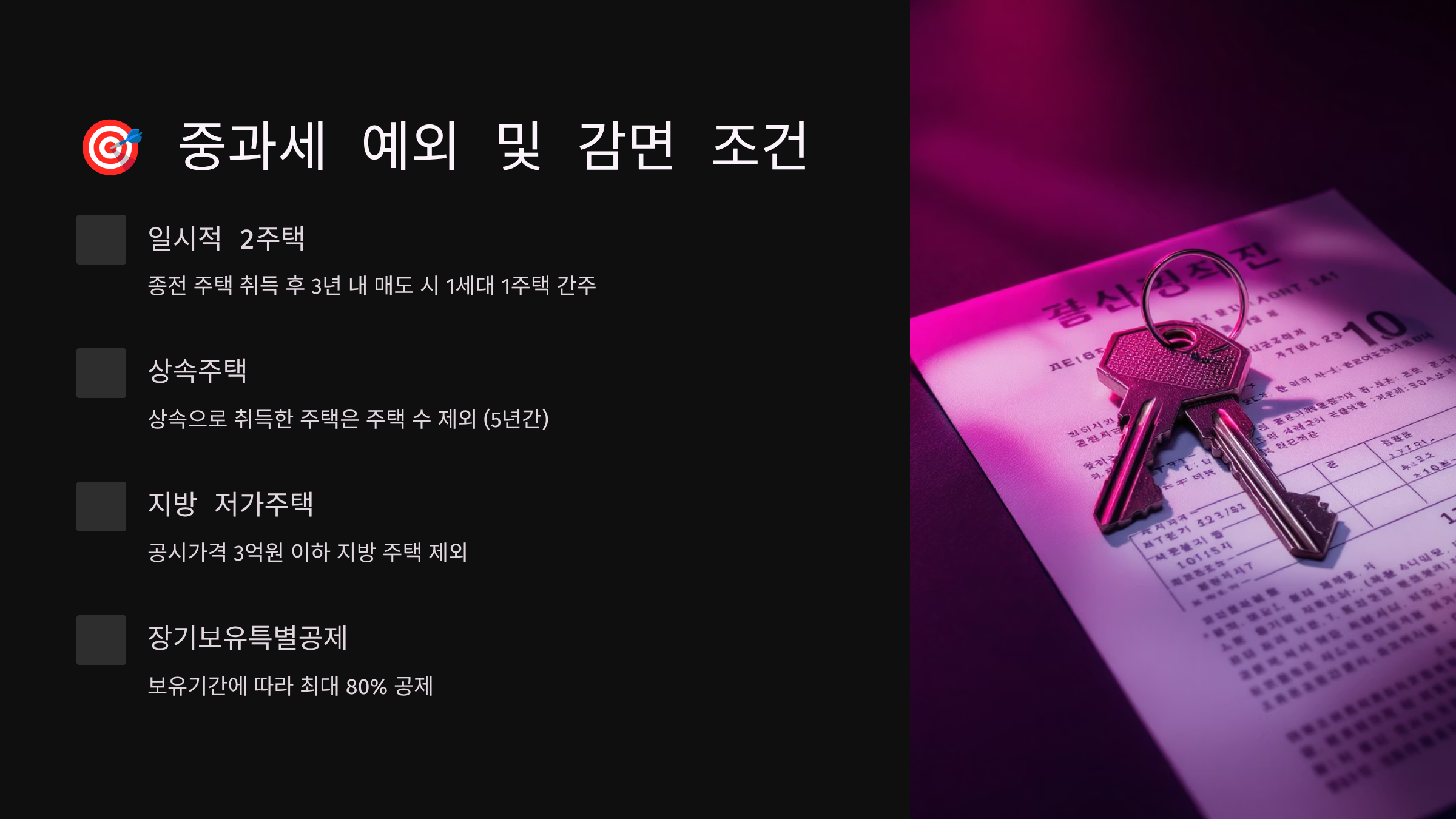혼인으로 인한 일시적 2 주택도 예외예요. 결혼한 부부가 각자 1채씩 가지고 있다가 합치면 2 주택이 되잖아요? 이 경우 혼인신고일로부터 5년간은 중과세를 유예해 줘요. 5년 내에 1채를 처분하면 중과세 없이 일반세율만 적용받아요. 신혼부부들에게는 정말 중요한 예외 조항이에요. 💑