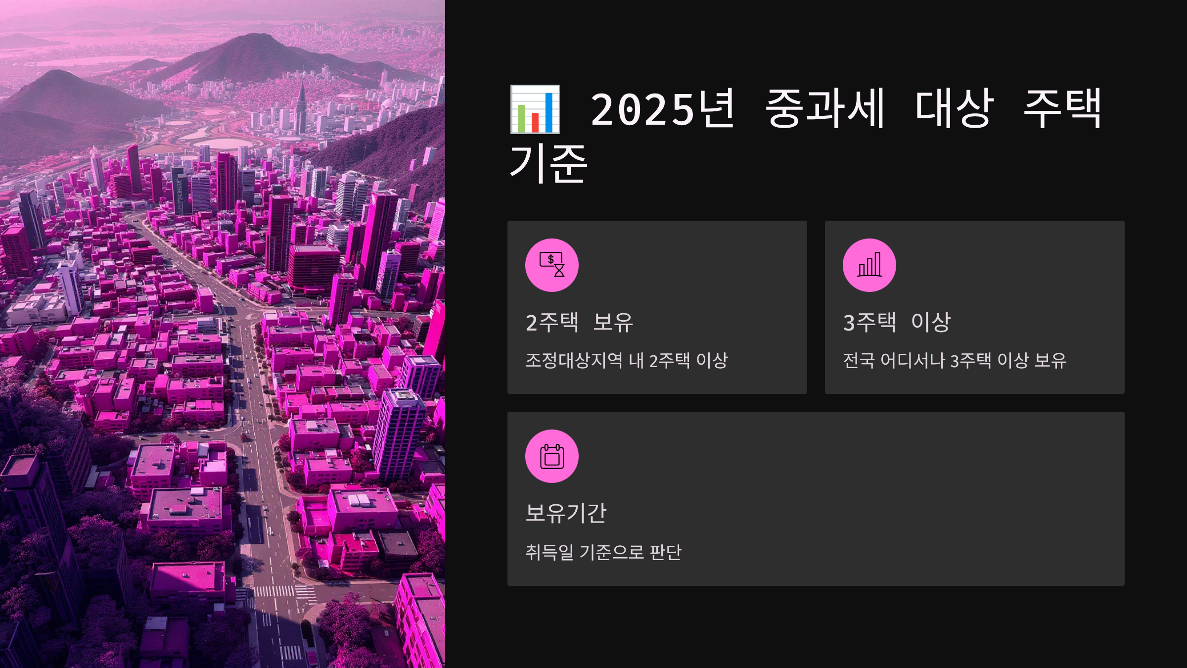 2025년 현재 중과세 대상이 되는 주택 기준이 예전보다 많이 완화됐어요. 하지만 여전히 조정대상지역 내 다주택자들은 주의가 필요해요. 우선 가장 기본적인 기준은 '1세대 2 주택 이상'이에요. 여기서 1세대란 거주자와 배우자, 그리고 같은 주소에 거주하는 가족을 말해요. 미성년 자녀가 주택을 소유해도 부모의 주택 수에 합산된다는 점, 꼭 기억하세요! 😊