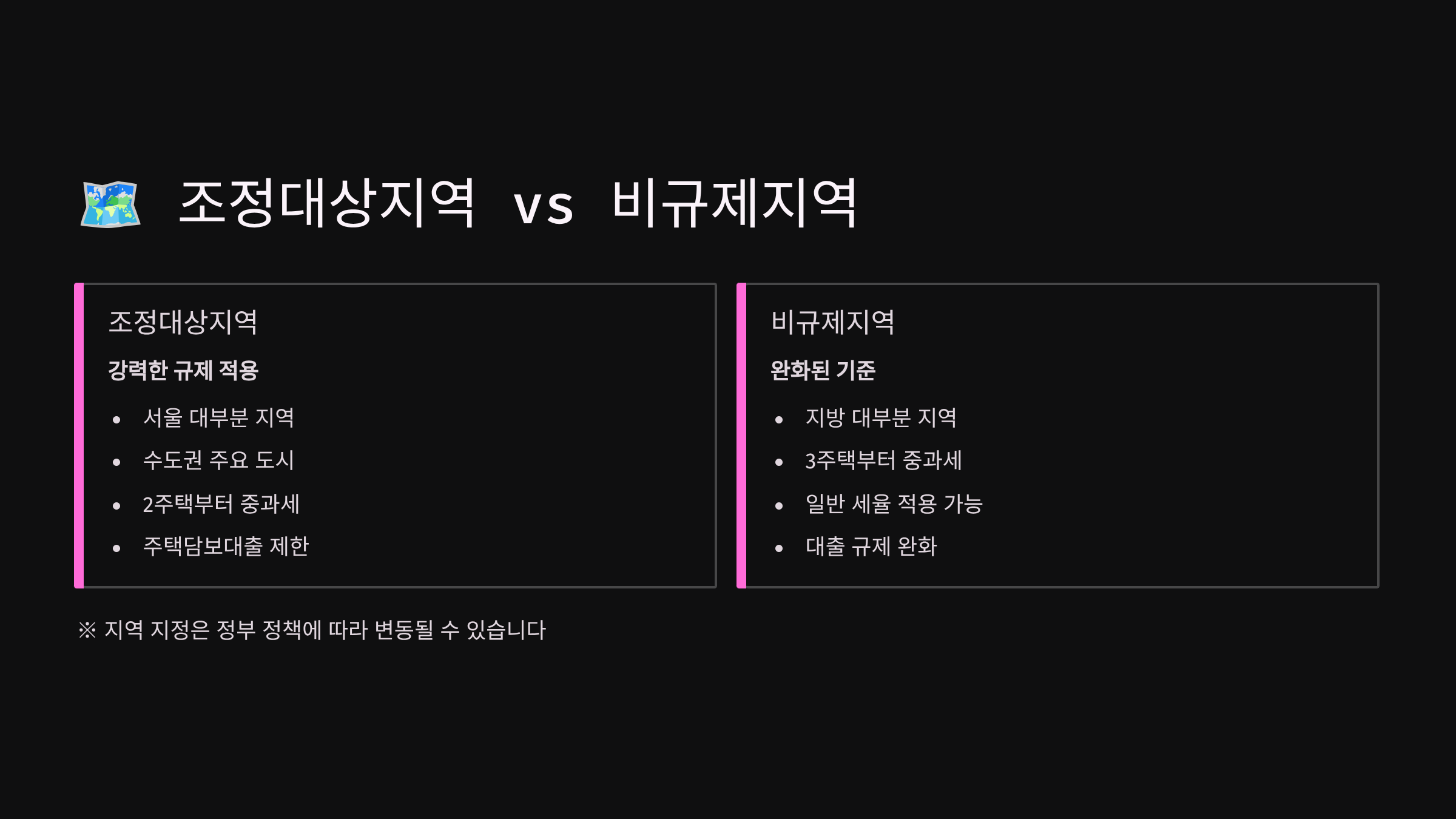 조정대상지역과 비규제지역의 차이를 정확히 아는 것은 부동산 투자의 기본이에요. 조정대상지역은 정부가 부동산 과열을 막기 위해 지정한 특별관리구역이에요. 2025년 1월 기준으로 서울 25개 구 전체, 경기도 주요 도시, 세종시, 그리고 광역시 일부 지역이 포함돼요. 이 지역에서는 대출 규제, 청약 규제, 세금 중과 등 각종 규제가 적용된답니다. 🏙️