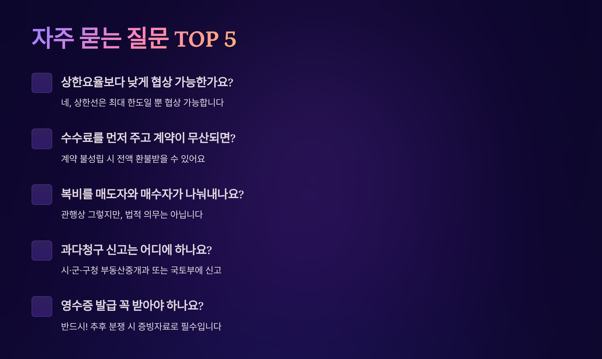 넷째 감정적으로 대응하지 않는 게 좋아요. 중개업자가 상한을 초과하는 금액을 요구했다고 해서 감정적으로 대응하면 협상이 어려워져요. 법적 근거를 차분하게 설명하면 대부분의 중개업자들은 합리적인 금액으로 조정해 줘요.