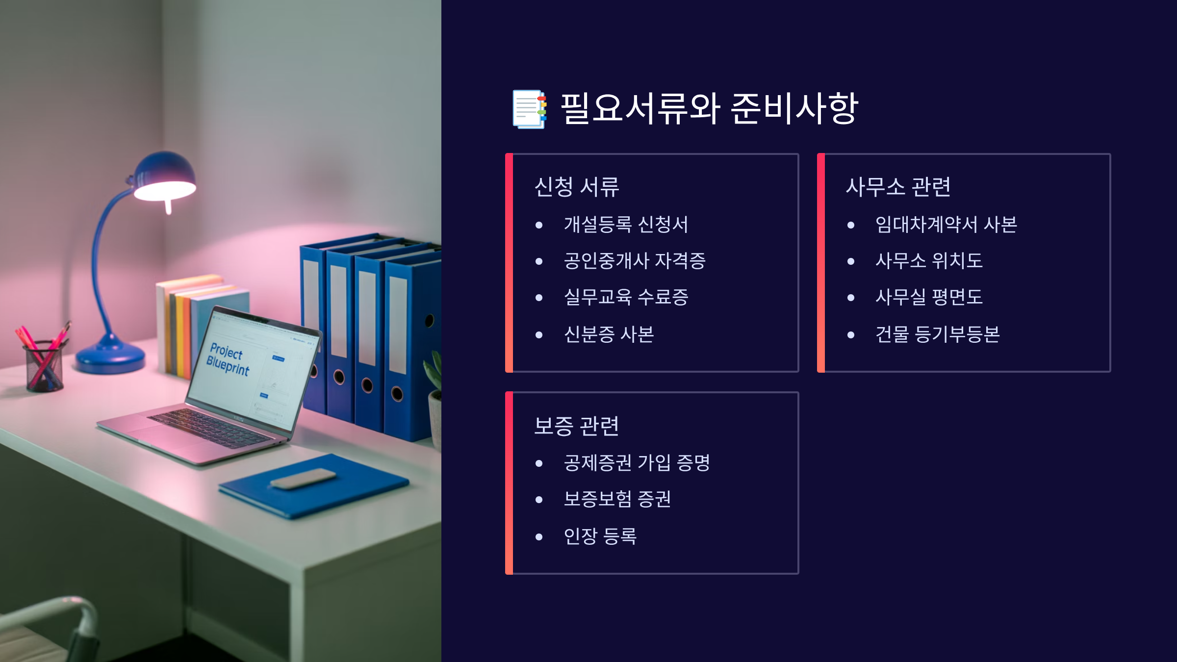 개설등록 신청 시 필요한 기본 서류는 개설등록신청서, 공인중개사 자격증 사본, 실무교육 수료증, 사무소 임대차계약서, 건축물대장, 사진(3.5 cm×4.5cm) 2 매예요. 법인의 경우 법인등기부등본, 정관, 주주명부 등 추가 서류가 필요해요. 특히 사무소 요건을 증명하는 서류들이 중요한데, 사무실 면적이 기준에 맞는지, 독립된 공간인지를 확인하는 과정이 까다로워요.