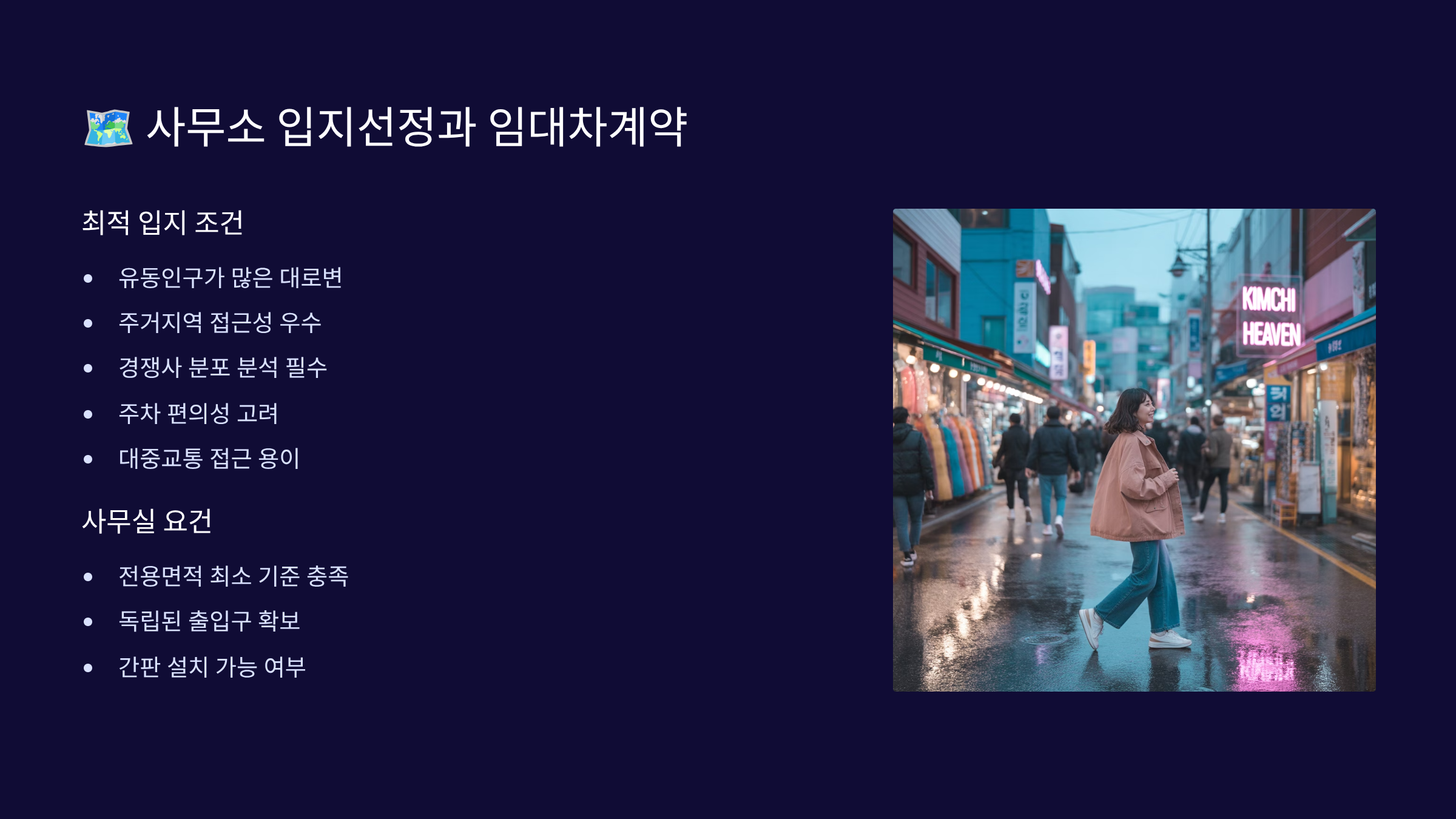 사무소는 반드시 독립된 공간이어야 하고, 타 업종과 겸업이 불가능해요. 주거용 오피스텔이나 원룸에서는 개설이 안 되고, 상업용 건물이어야 해요. 최소 면적 기준은 없지만, 실질적으로 업무를 수행할 수 있는 공간이어야 하며, 간판 설치가 가능한 곳이어야 해요. 건물 용도가 근린생활시설로 등재되어 있는지 건축물대장에서 확인하는 것이 필수랍니다!