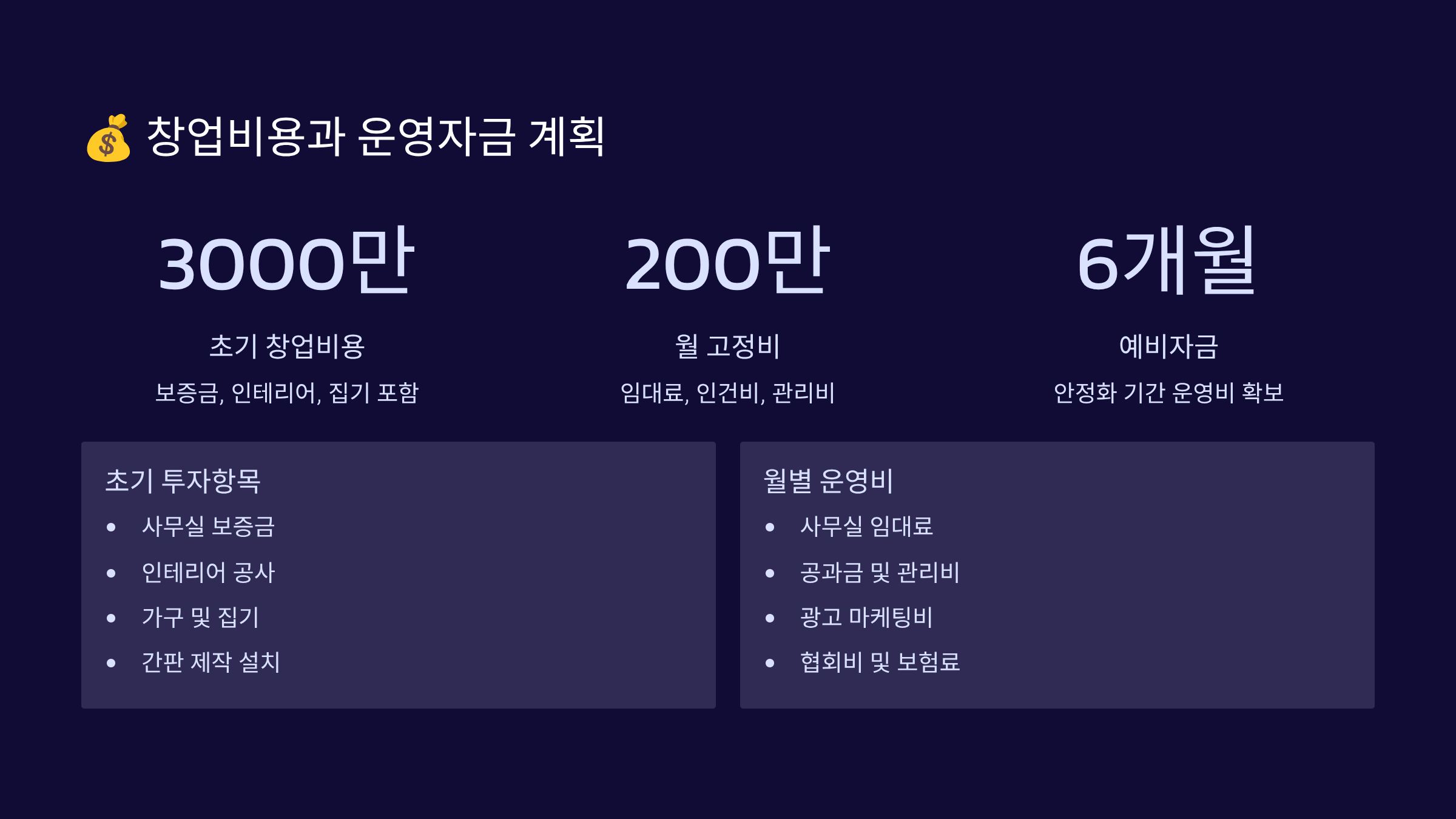 | 운영자금 | 2000~3000만원 | 1000~1500만원 | 6개월분 |