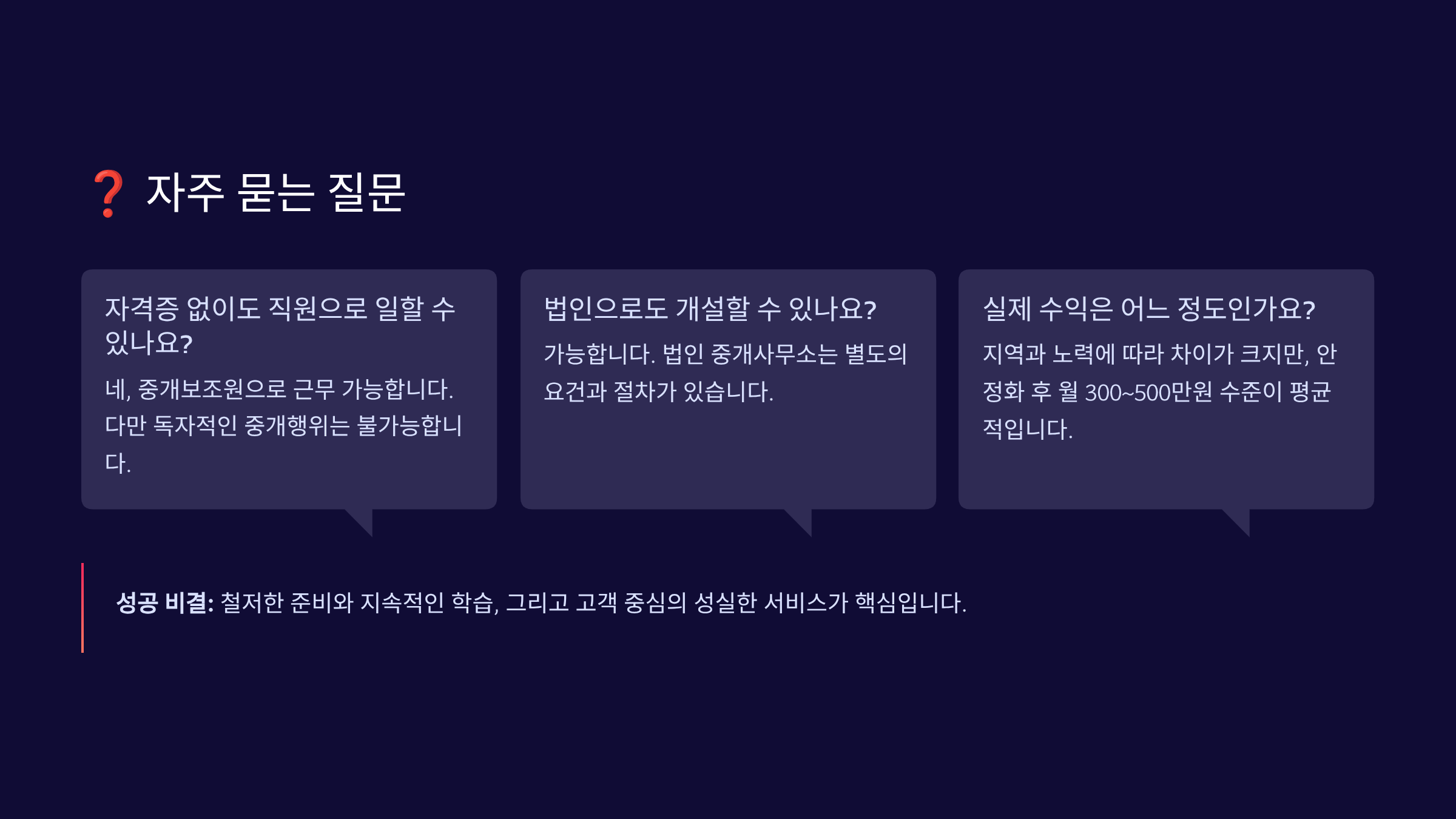 A5. 원칙적으로 같은 사무소에서 다른 영업을 겸업할 수 없어요. 중개사무소는 독립된 공간이어야 하고, 다른 업종과 구분되어야 해요. 다만 별도 사업자로 다른 사업을 하는 것은 가능해요. 부동산 컨설팅, 경매 대행, 분양 대행 등 관련 업무는 중개업과 함께 할 수 있지만, 이 경우에도 별도 신고가 필요할 수 있어요.