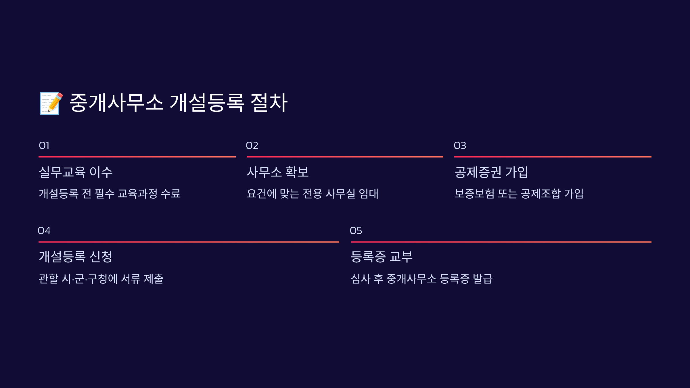 부동산 중개업을 시작하려면 법적 요건을 충족하고 행정 절차를 완료해야 해요. 단순히 자격증만 있다고 바로 영업을 할 수 있는 게 아니라, 사무소 개설등록과 중개업 등록을 거쳐야 정식으로 영업이 가능하답니다. 이 과정에서 필요한 모든 정보를 상세히 알려드릴게요! 🏘️