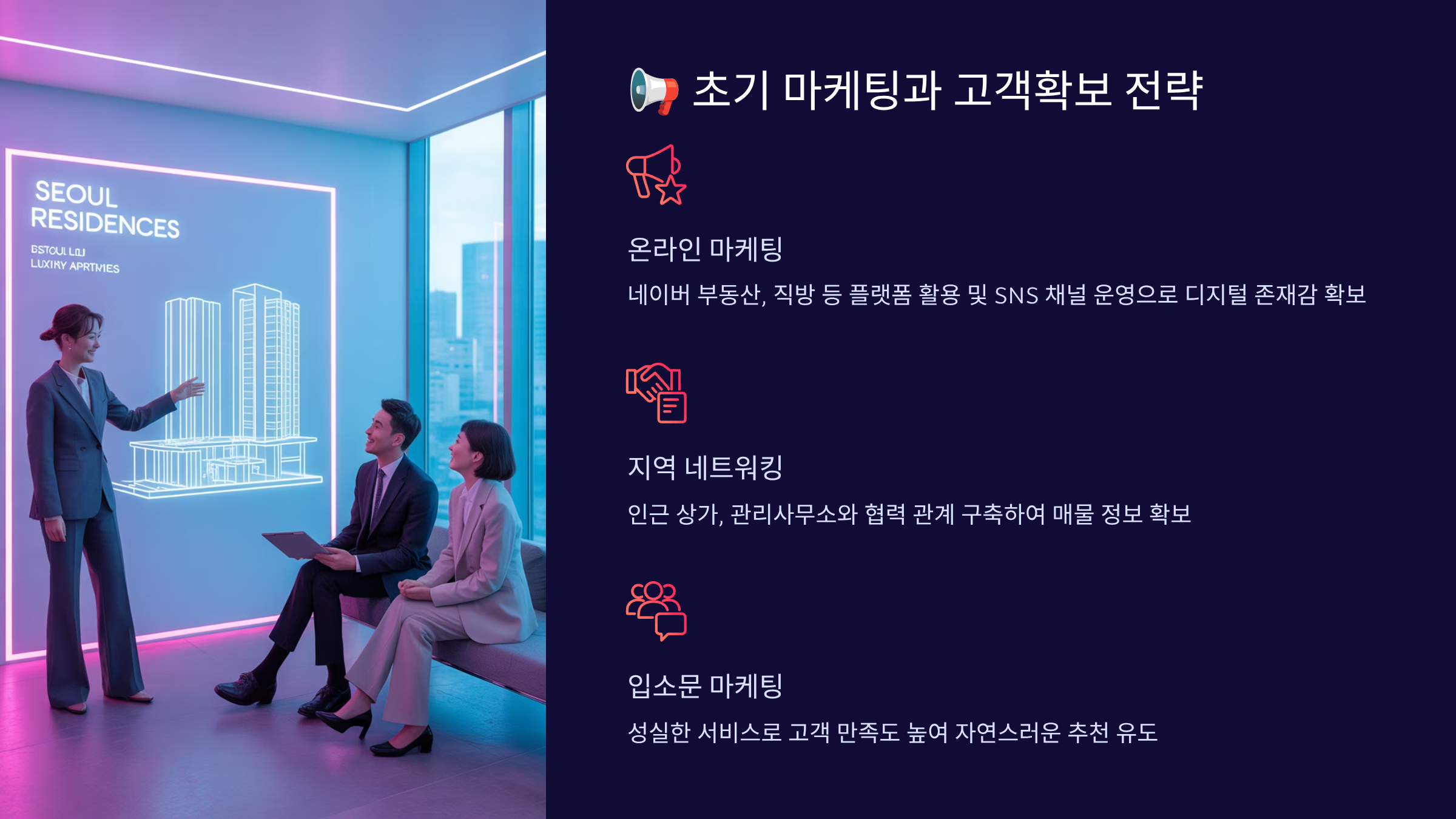 개업 초기 마케팅은 사업 성공의 열쇠예요. 오프라인과 온라인을 적절히 조합한 통합 마케팅이 효과적이에요. 개업 전부터 SNS 계정을 만들어 지역 부동산 정보를 공유하면서 인지도를 쌓아가는 것이 좋아요. 인스타그램, 페이스북, 네이버 블로그, 유튜브 등 다양한 채널을 활용하되, 모든 채널을 다 하기보다는 2~3개에 집중하는 것이 효율적이에요.