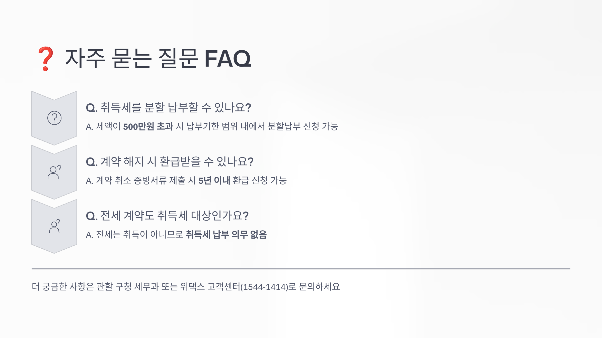 A5. 아니에요. 전체 매매가에 대한 취득세를 내야 해요. 5억 아파트에 3억 전세가 있어도 5억 전체에 대한 취득세를 납부해야 합니다.