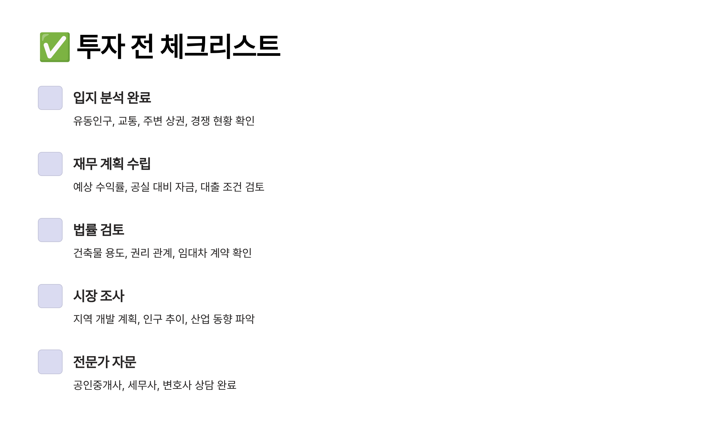 ⚖️ 면책조항: 본 콘텐츠는 일반적인 정보 제공을 목적으로 작성되었으며, 개인의 투자 조언이나 권유로 해석되어서는 안 됩니다. 상가 투자는 다양한 리스크가 존재하며, 투자 결정 전 반드시 전문가와 상담하시기 바랍니다. 본 정보를 바탕으로 한 투자 결정과 그에 따른 손실에 대해서는 투자자 본인이 모든 책임을 집니다. 시장 상황은 수시로 변동할 수 있으며, 과거의 성과가 미래 수익을 보장하지 않습니다.
