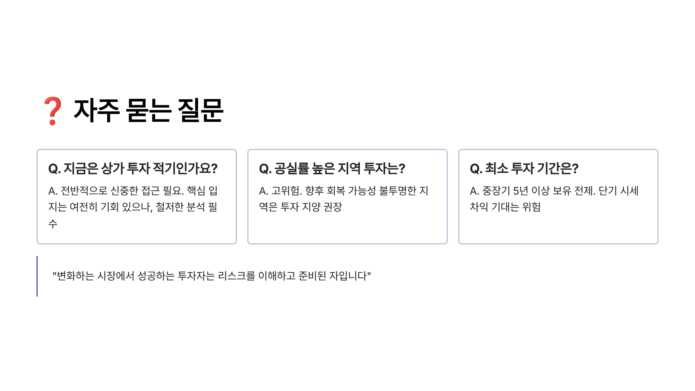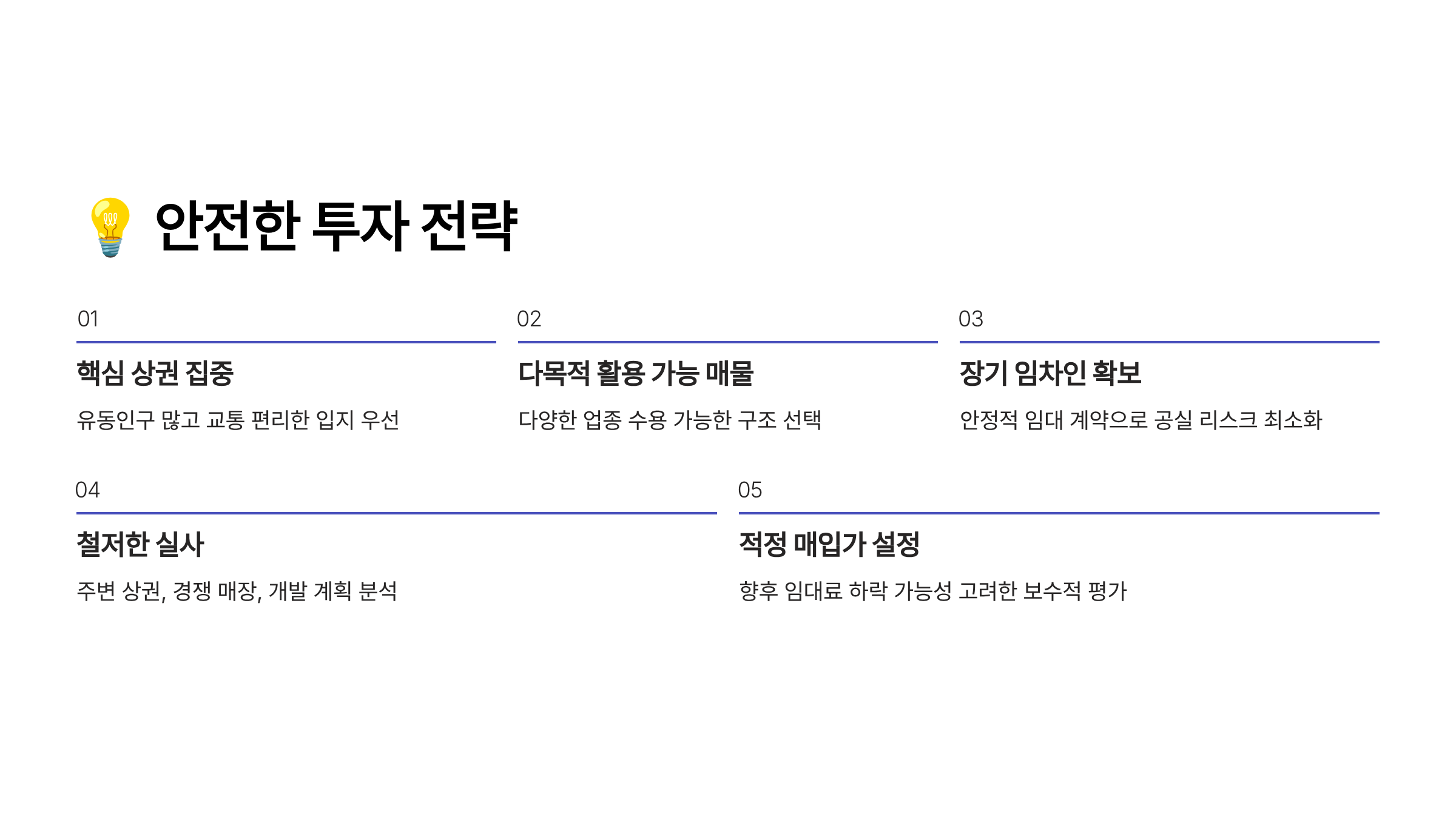 | 공실 리스크 | 상 | 수익 중단 | 입지 선별 |