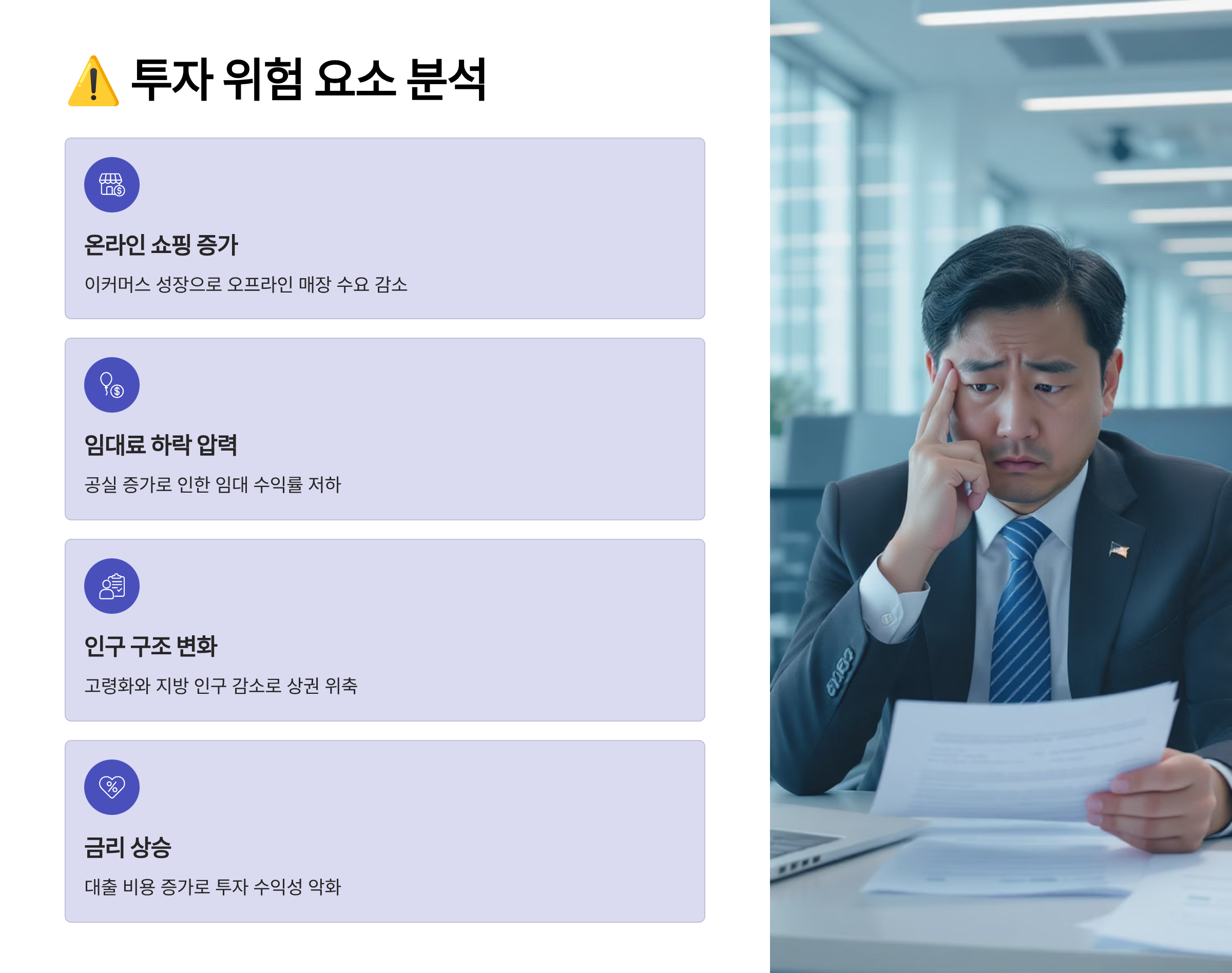 업종 변화 리스크도 고려해야 해요. 온라인 쇼핑 확대로 오프라인 매장 수요가 줄어들면서 특정 업종의 몰락이 가속화되고 있어요. 예를 들어, 서점, DVD방, 노래방 등은 이미 사양 산업이 됐고, 의류 매장과 화장품 가게도 위기를 맞고 있답니다. 투자한 상가의 업종이 쇠퇴하면 공실 위험이 크게 높아져요.