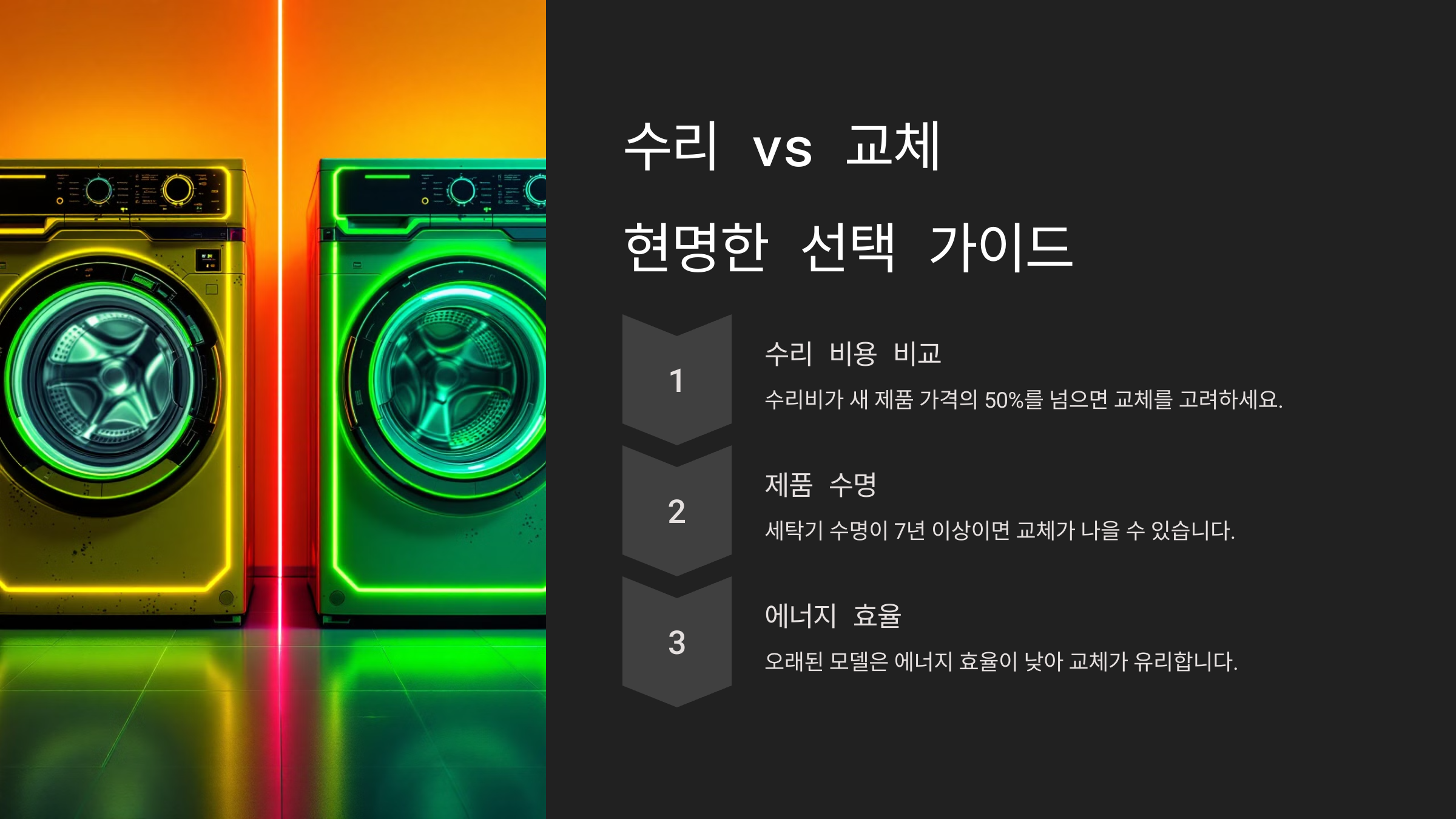 만약 수리비가 새 세탁기 가격의 절반을 넘는다면 새 제품을 구매하는 것이 더 경제적일 수 있어요. 예를 들어, 40만 원짜리 세탁기를 사용 중인데 수리비가 20만 원 이상이라면 교체를 고려해 보세요.