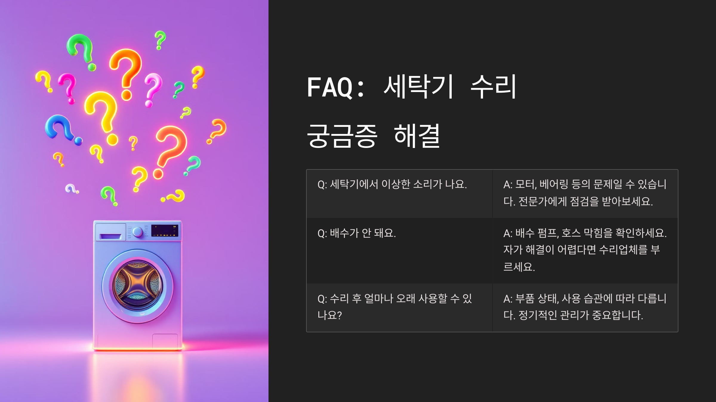 Q1. 세탁기 수리비가 너무 비싼데, 새 제품을 사는 게 나을까요?