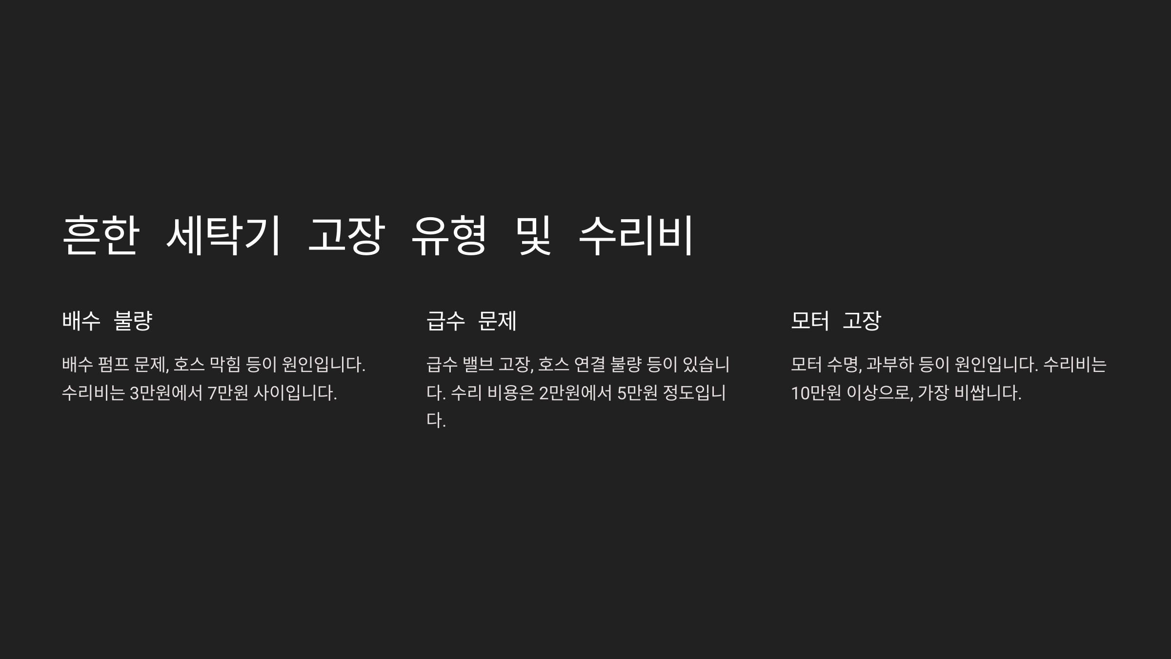 | 배수가 안 됨 | 배수 필터 막힘, 펌프 고장 | 필터 청소, 펌프 교체 |