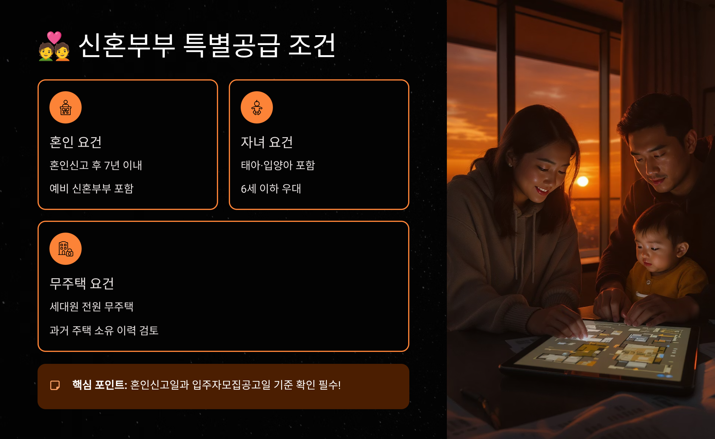 신혼부부 특별공급 대상이 되려면 몇 가지 조건을 충족해야 해요. 우선 혼인신고일 기준 7년 이내여야 하고, 무주택 세대구성원이어야 해요. 2018년부터는 예비 신혼부부와 한부모 가족도 포함되어 대상이 확대되었답니다. 예비 신혼부부는 입주 전까지 혼인신고를 완료해야 하고, 한부모 가족은 만 6세 이하 자녀를 둔 경우에 해당돼요.