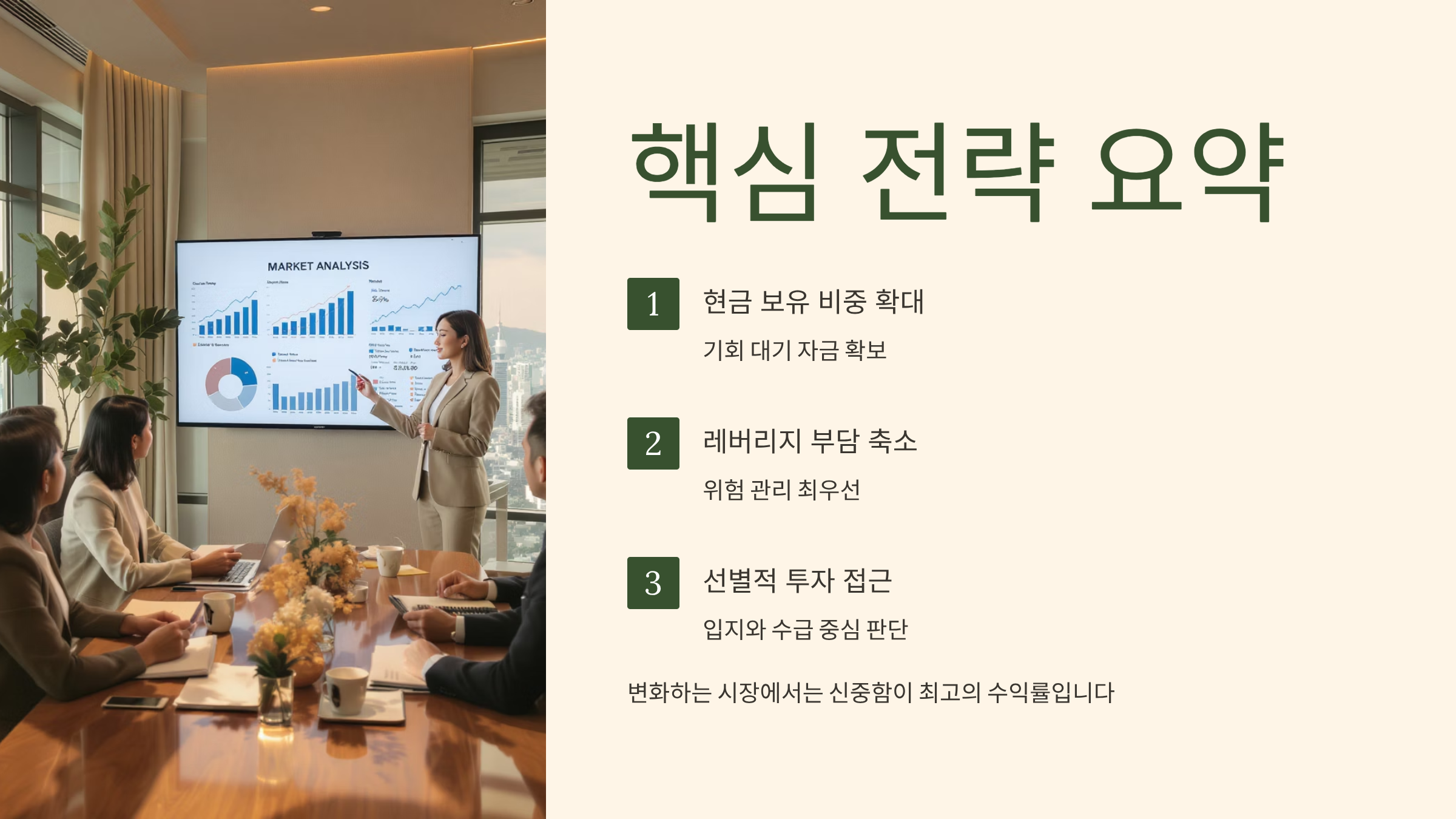 투자 전략은 시나리오별로 달라져야 해요. 연착륙 시나리오에서는 우량 지역 위주로 선별 투자하고, 급락 시나리오에서는 현금을 확보해 두었다가 적극 매수하는 전략이 유효해요. 장기 침체 시나리오라면 부동산 비중을 줄이고 해외 자산이나 성장주에 투자하는 것이 나을 수 있어요.