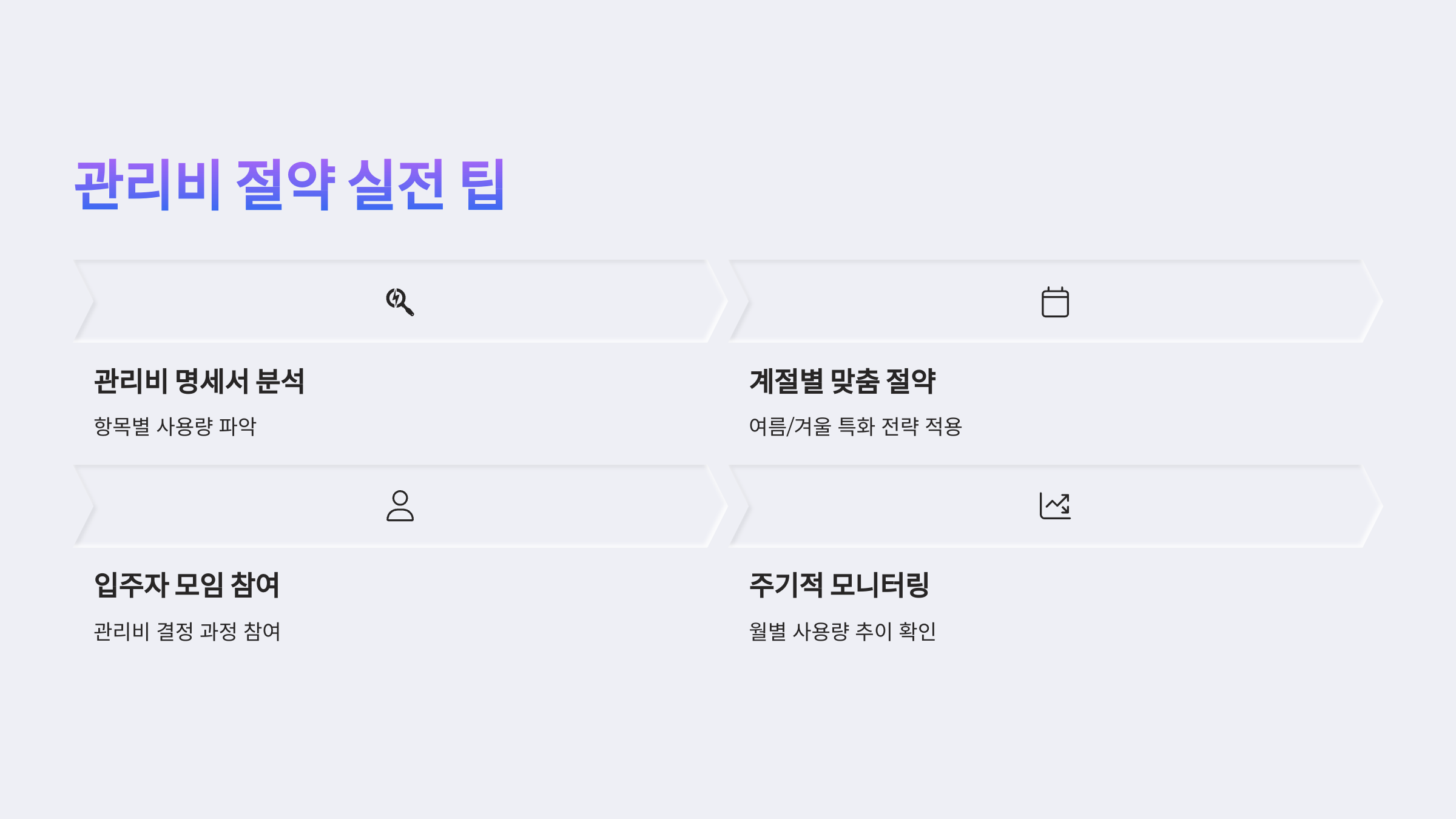 일반관리비와 청소비는 매달 고정적으로 나가는 비용이라 한 번 절감하면 지속적인 효과를 볼 수 있어요. 입주자대표회의에서 관리 효율화 방안을 적극적으로 논의하고, 우수 사례를 벤치마킹하는 것도 좋은 방법이에요. 관리비 절감은 결국 우리 모두의 노력으로 이루어진답니다!