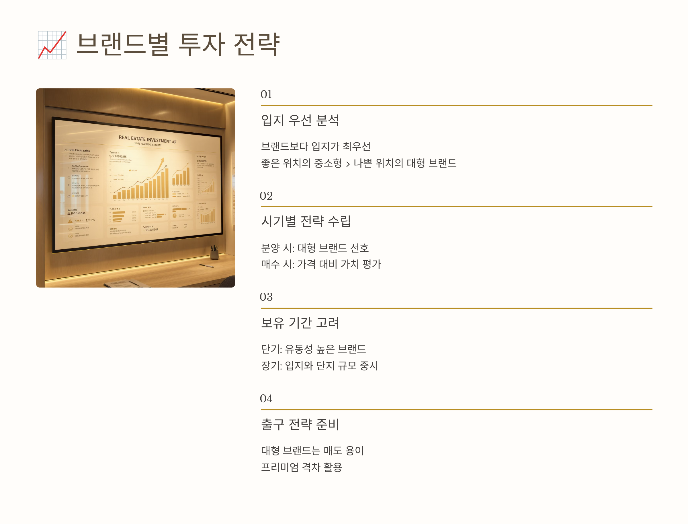 아파트 투자에서 브랜드를 어떻게 활용할 것인가는 매우 중요한 전략적 선택이에요. 투자 목적, 자금 규모, 투자 기간에 따라 접근 방법이 달라져야 하죠. 지금부터 브랜드별 투자 전략을 구체적으로 알아보겠습니다. 💼
