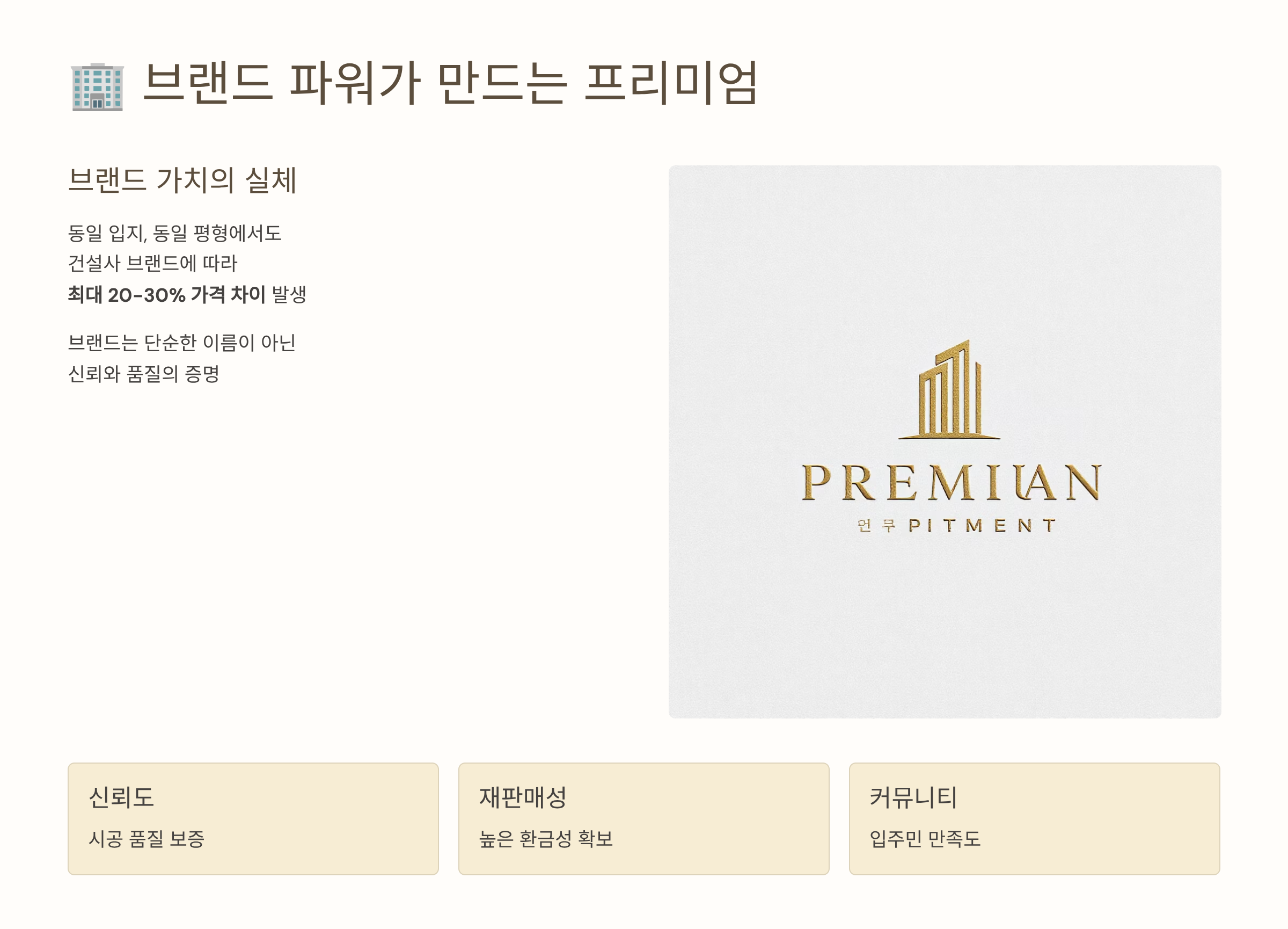 브랜드가 시세에 미치는 영향은 시간이 지날수록 더 커지는 경향이 있어요. 신축 당시에는 10% 정도의 차이였던 것이 10년 후에는 20-30%까지 벌어지는 경우가 많죠. 이는 브랜드 아파트의 관리 품질과 커뮤니티 가치가 시간이 지나도 잘 유지되기 때문이에요. 🏗️