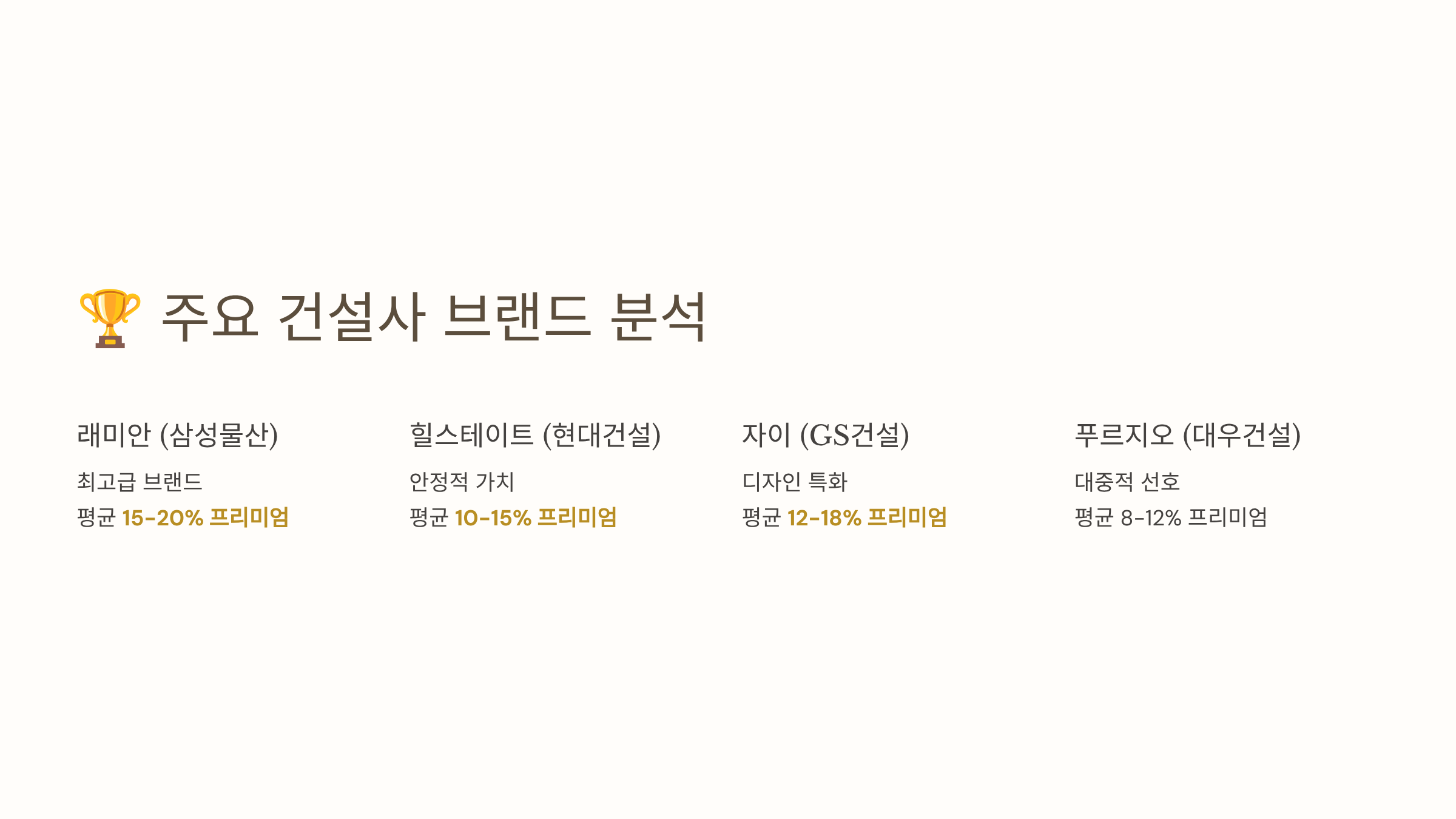 평형대별로도 전략이 달라요. 소형 평형(전용 59㎡ 이하)은 브랜드보다 입지가 더 중요한 경향이 있고, 중대형 평형(전용 84㎡ 이상)일수록 브랜드 프리미엄이 크게 작용해요. 특히 전용 100㎡ 이상 대형 평형은 브랜드가 절대적인 영향력을 발휘하죠.