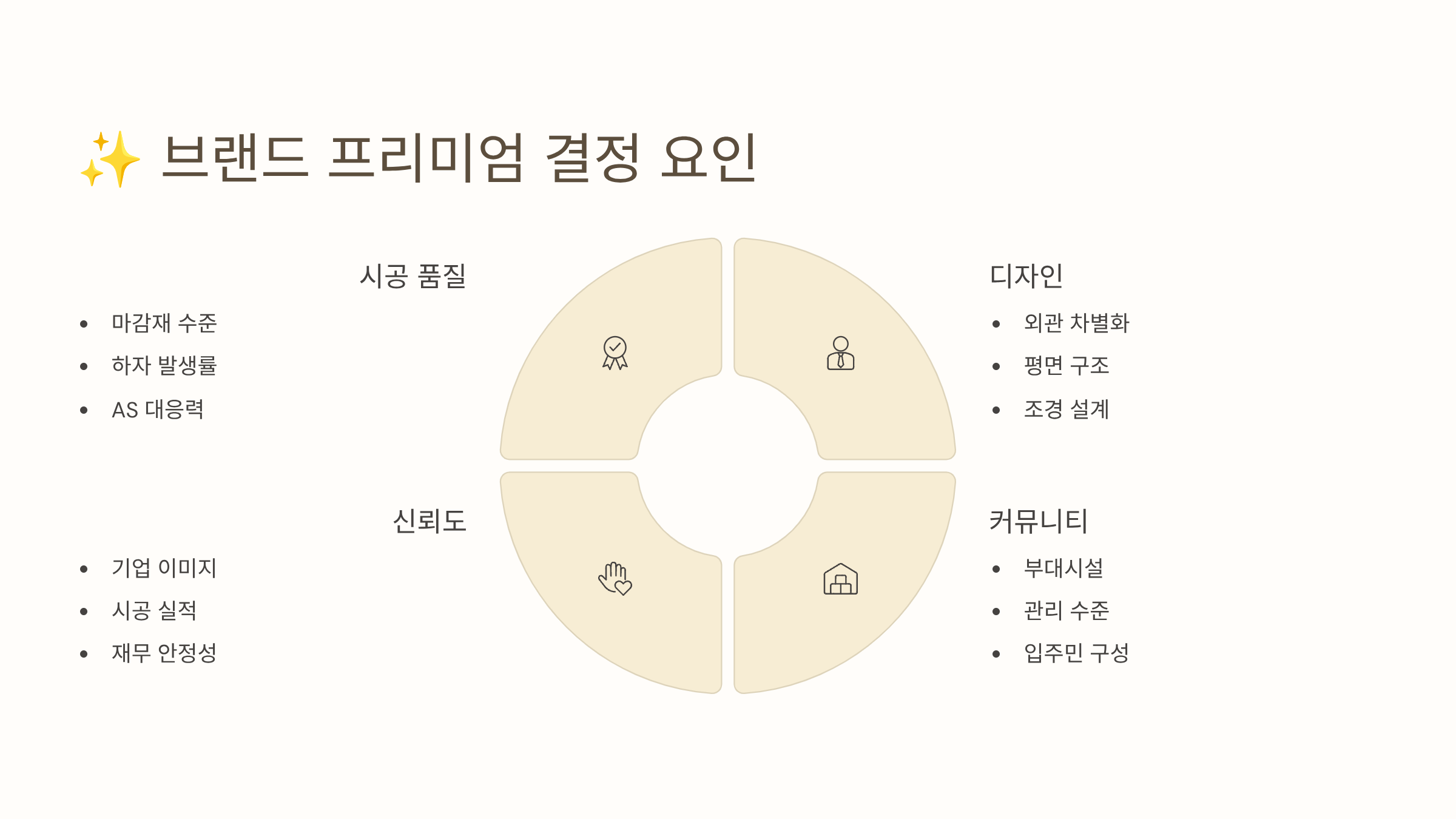 아파트 브랜드 프리미엄을 결정짓는 요인들은 매우 다양하고 복잡해요. 단순히 건설사 이름만으로 결정되는 것이 아니라, 여러 요소들이 복합적으로 작용해서 만들어지는 결과물이랍니다. 이제 그 핵심 요인들을 하나씩 자세히 살펴볼게요. 🔍