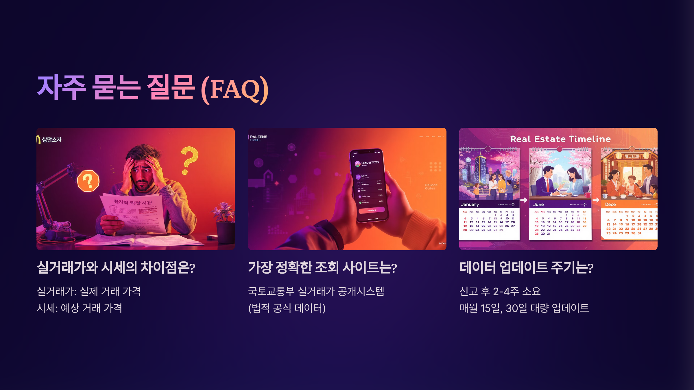 여섯째, 출구 전략을 수립할 수 있어요. 투자는 사는 것보다 파는 타이밍이 더 중요해요. 실거래가 추이를 보면 매도 적기를 판단할 수 있어요. 거래량이 줄어들기 시작하거나, 호가와 실거래가의 차이가 벌어지기 시작하면 시장이 꺾이는 신호일 수 있어요. 이런 신호를 미리 포착하면 적절한 시점에 투자금을 회수할 수 있어요.