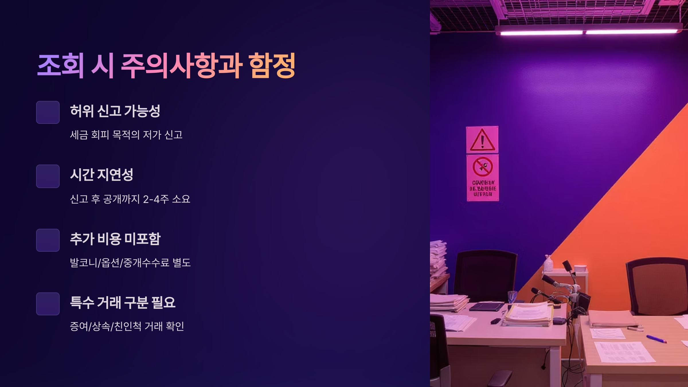 네 번째 주의점은 '허위 신고'의 가능성이에요. 드물지만 세금 회피나 대출 한도를 높이기 위해 실제보다 높거나 낮은 가격으로 신고하는 경우가 있어요. 또한 다운계약(실제 거래가보다 낮게 신고)이나 업계약(실제보다 높게 신고)도 있을 수 있어요. 이런 거래들은 주변 시세와 크게 차이 나므로 주의 깊게 봐야 해요.