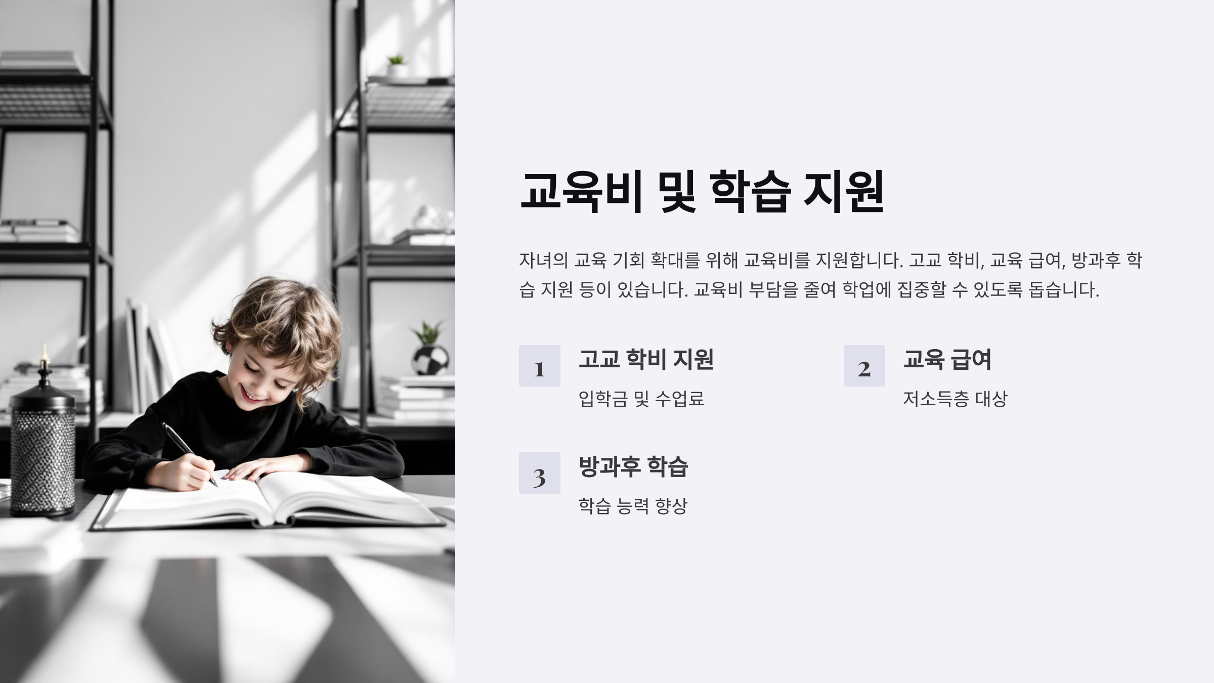 | 방과후 학습비 | 저소득층 학생 | 연간 50만 원 |