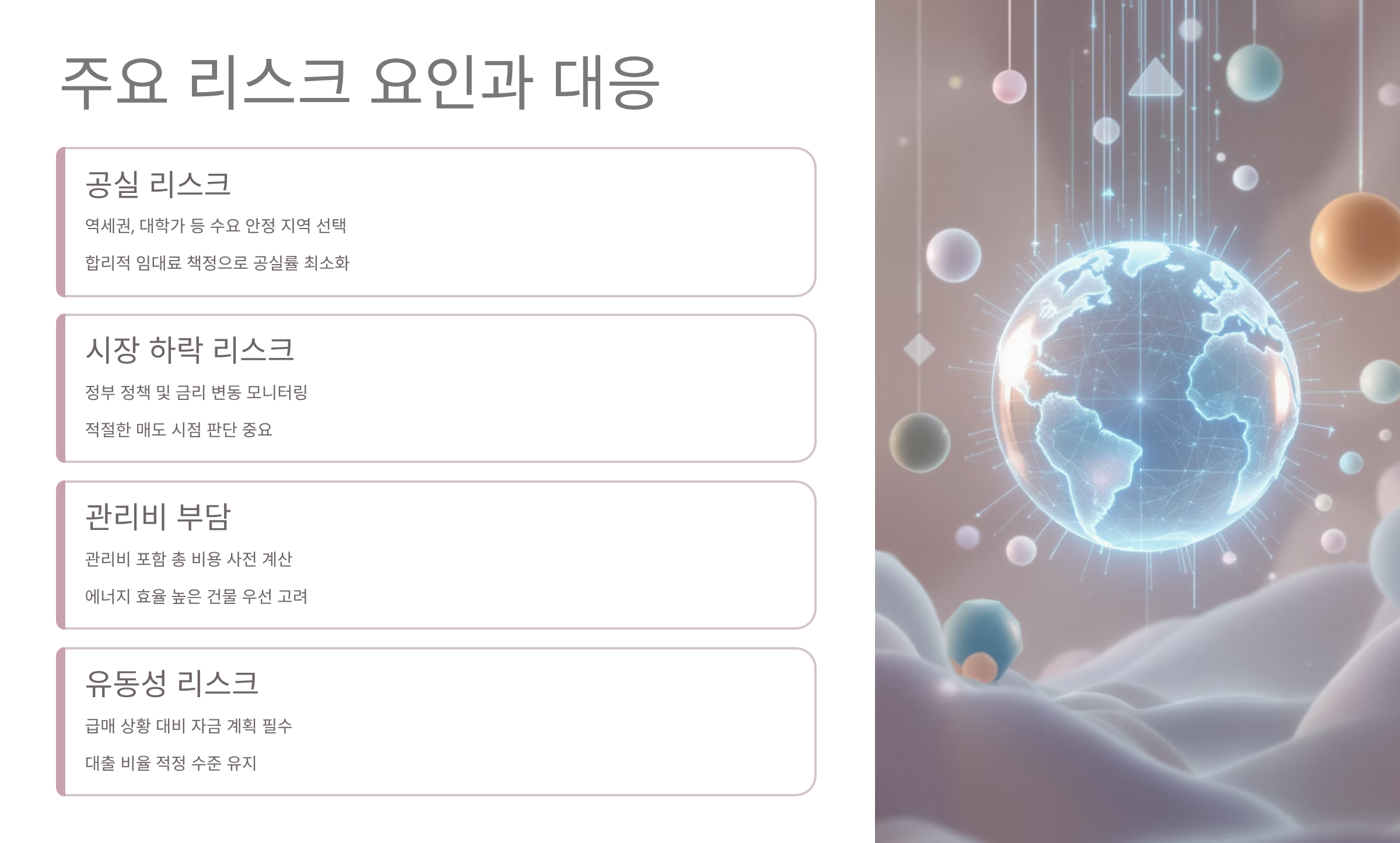 리스크 관리의 핵심은 분산 투자예요. 한 곳에 모든 자금을 투자하지 말고, 여러 지역이나 상품에 나눠서 투자하세요. 또한 투자 금액의 30% 이상은 예비 자금으로 남겨두는 게 좋아요. 예상치 못한 상황이 발생했을 때 대응할 수 있는 여력을 확보하는 거죠. 리스크를 완전히 없앨 순 없지만, 관리는 가능하답니다! 💪