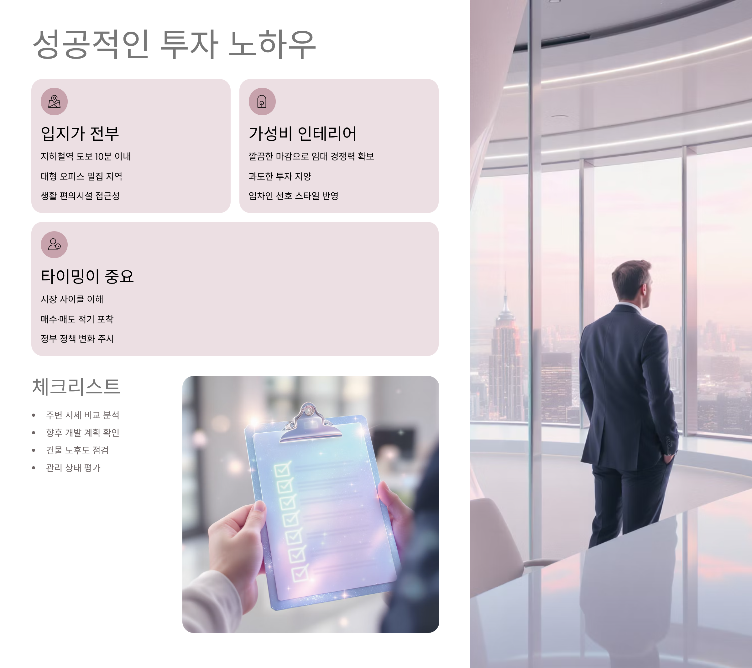 마지막으로 오피스텔은 감가상각이 빠르다는 점을 알아두세요. 아파트보다 노후화가 빨리 진행되고, 10년이 지나면 가치가 크게 떨어질 수 있어요. 그래서 단기 투자 전략을 세울 때는 3-5년 내 exit 전략을 명확히 해두는 게 중요하답니다. 💰