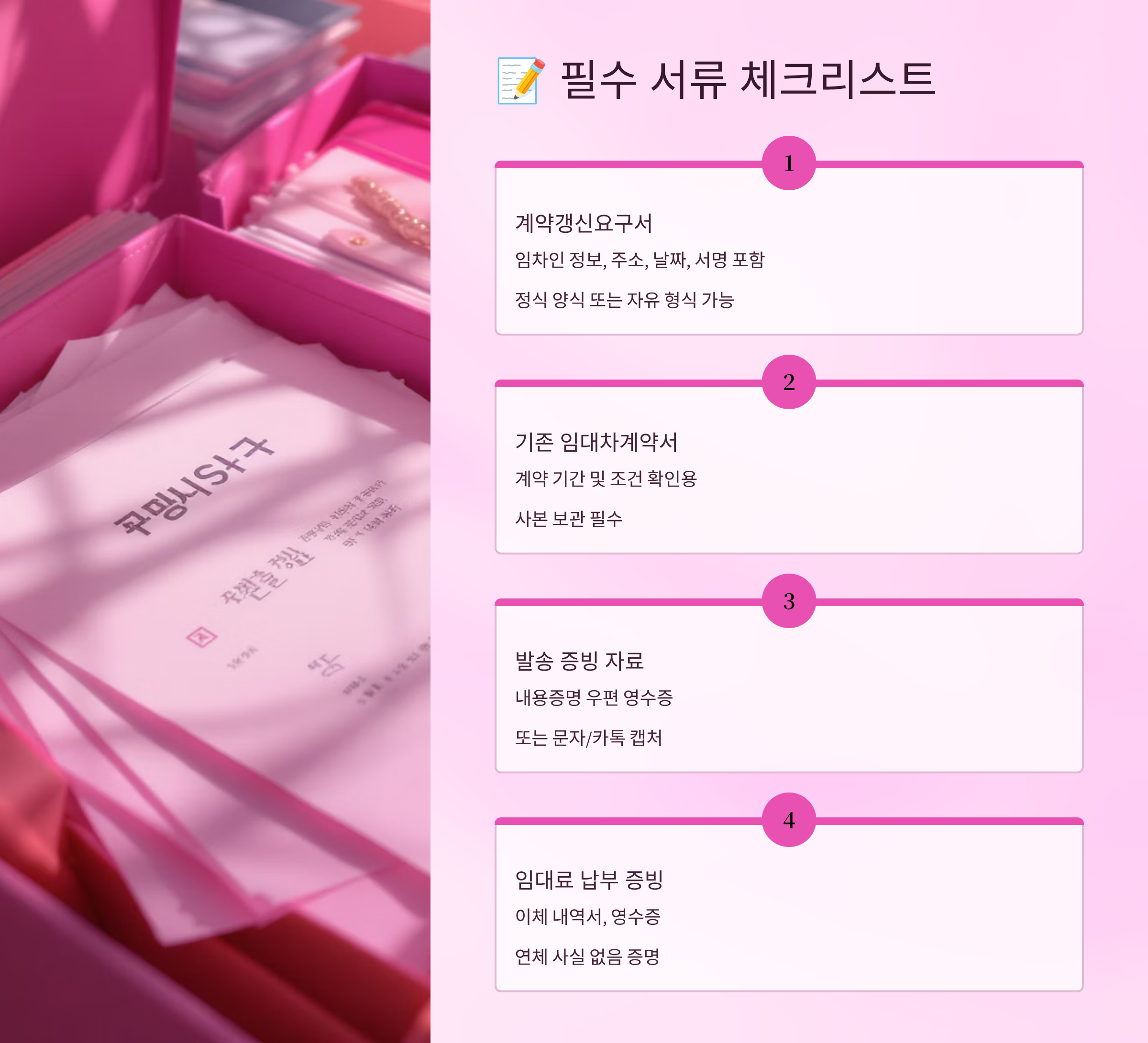 갱신 요구서 작성도 신경 써야 해요. 내용증명우편으로 보내는 것이 가장 확실하지만, 비용이 부담된다면 다른 방법도 있어요. 이메일로 보낼 때는 수신 확인이 가능한 방법을 사용하고, 문자메시지는 장문 문자로 상세히 작성한 뒤 스크린숏과 함께 통신사 문자 이용 내역서를 발급받아 보관하세요. 카카오톡도 법적 효력이 있지만, 대화방을 나가면 기록이 사라질 수 있으니 주의해야 해요.